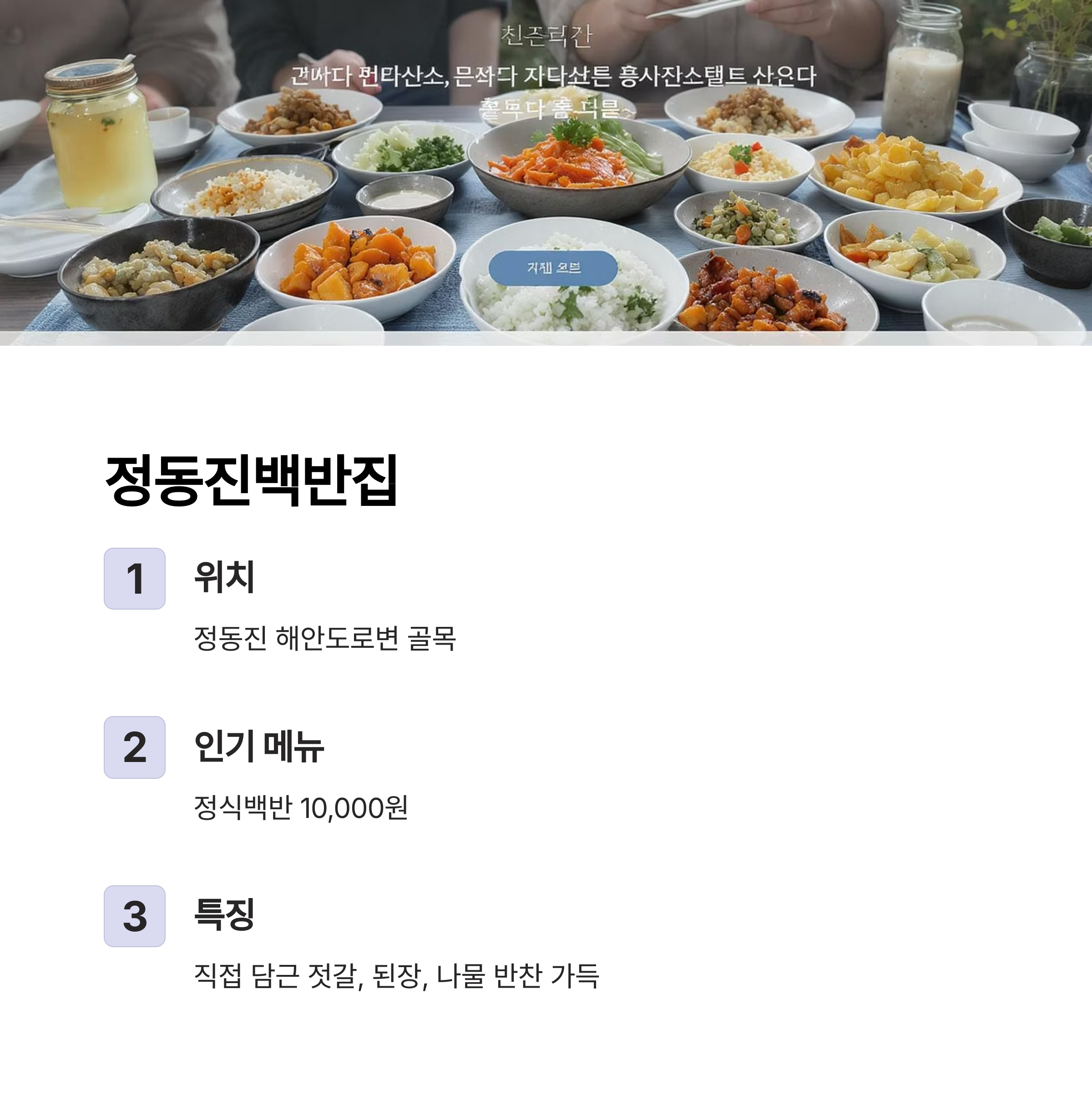 - 인기 메뉴: 정식백반 10,000원