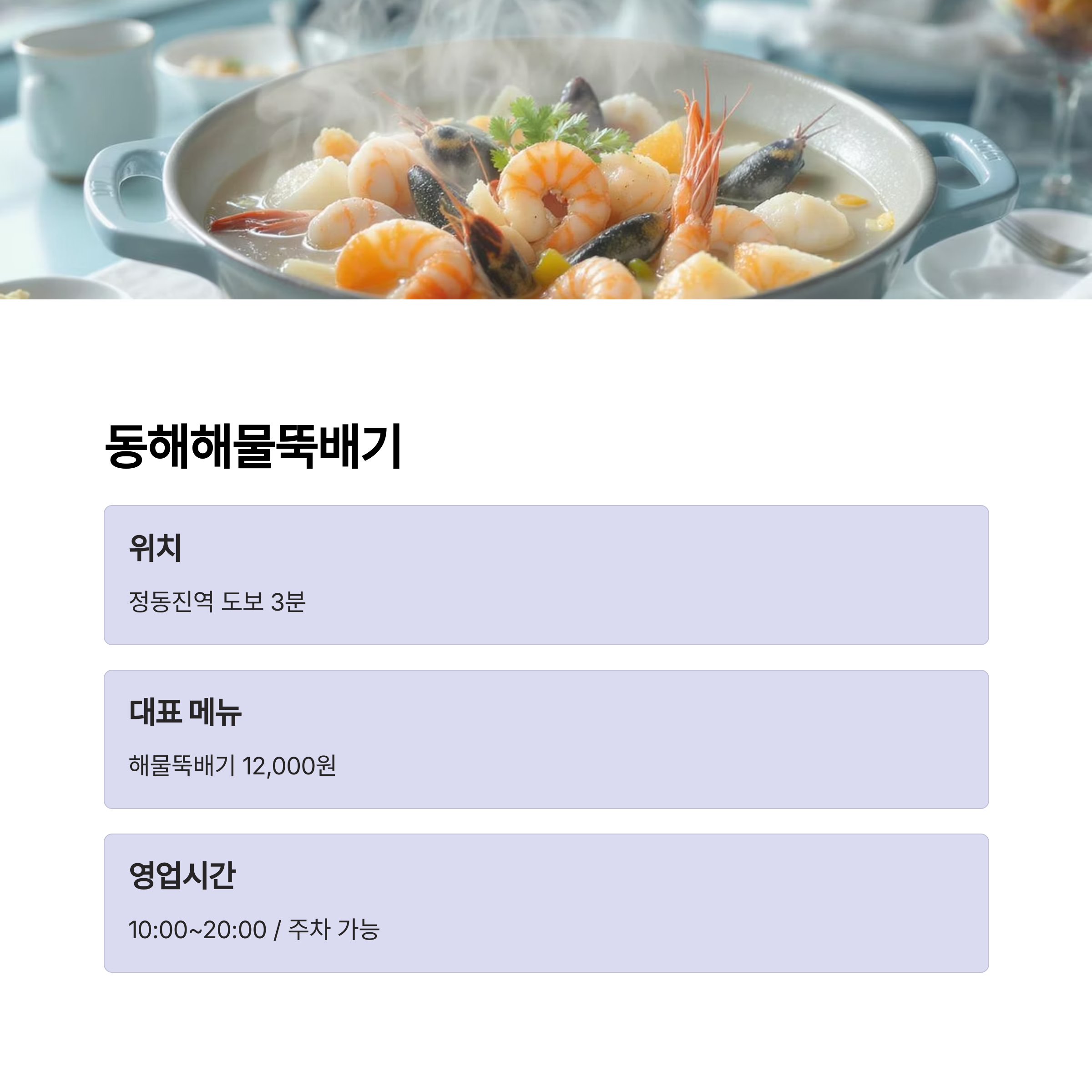 - 대표 메뉴: 해물뚝배기 12,000원
