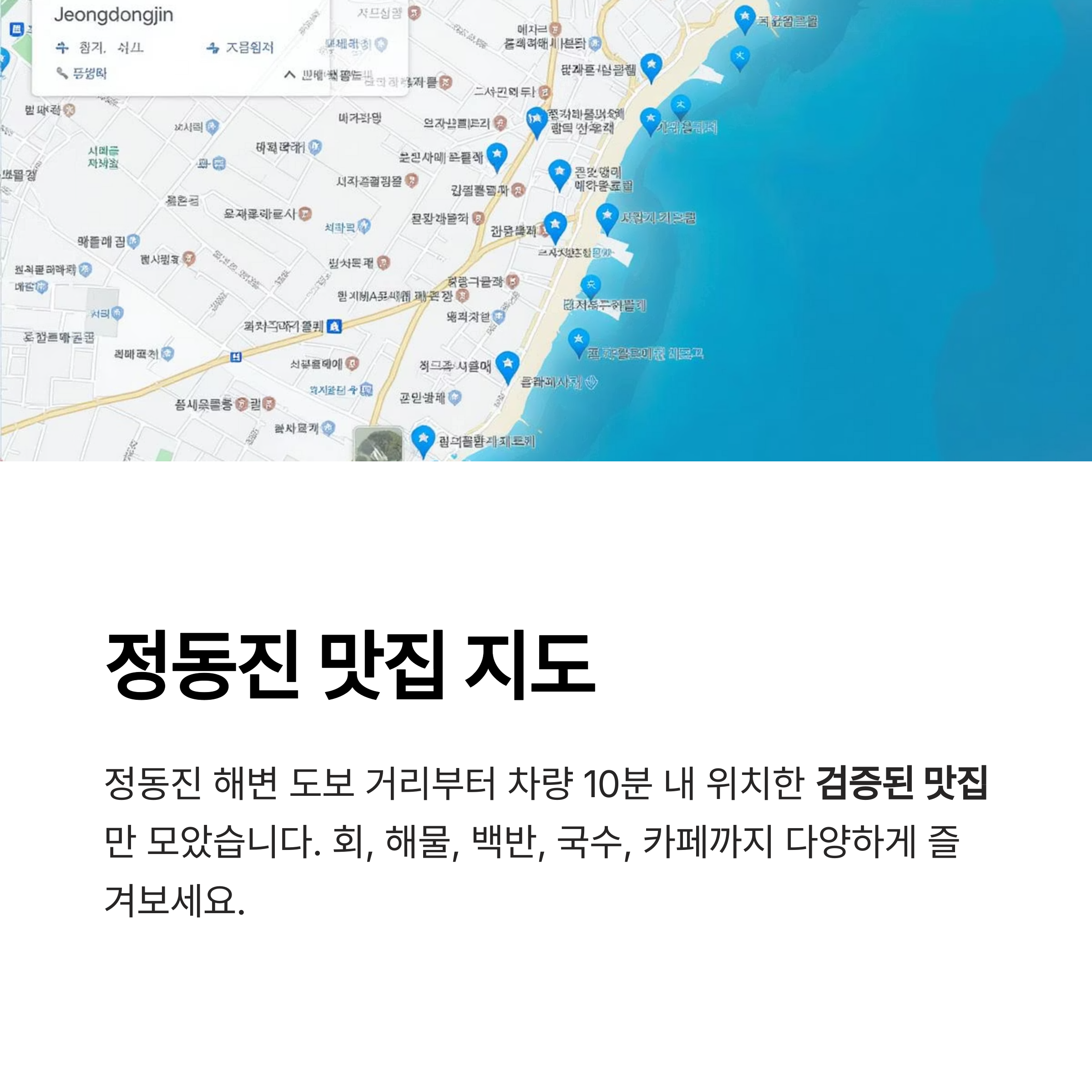 차량 10분 내 이동 가능한 맛집까지 바다 근처의 검증된 식당 위주로 구성했습니다.