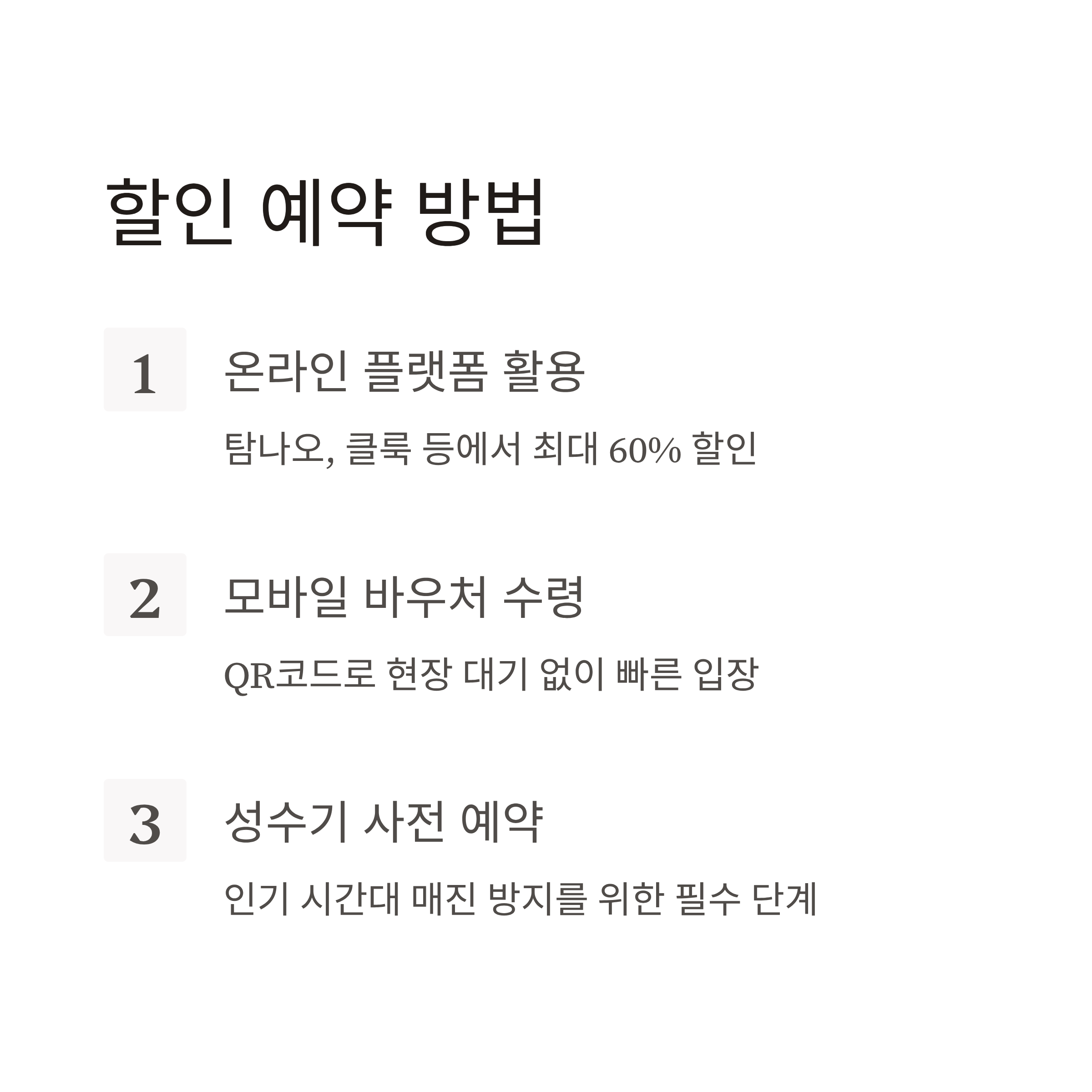 | 온라인 예매 | 현장보다 저렴, 대기 최소화 |