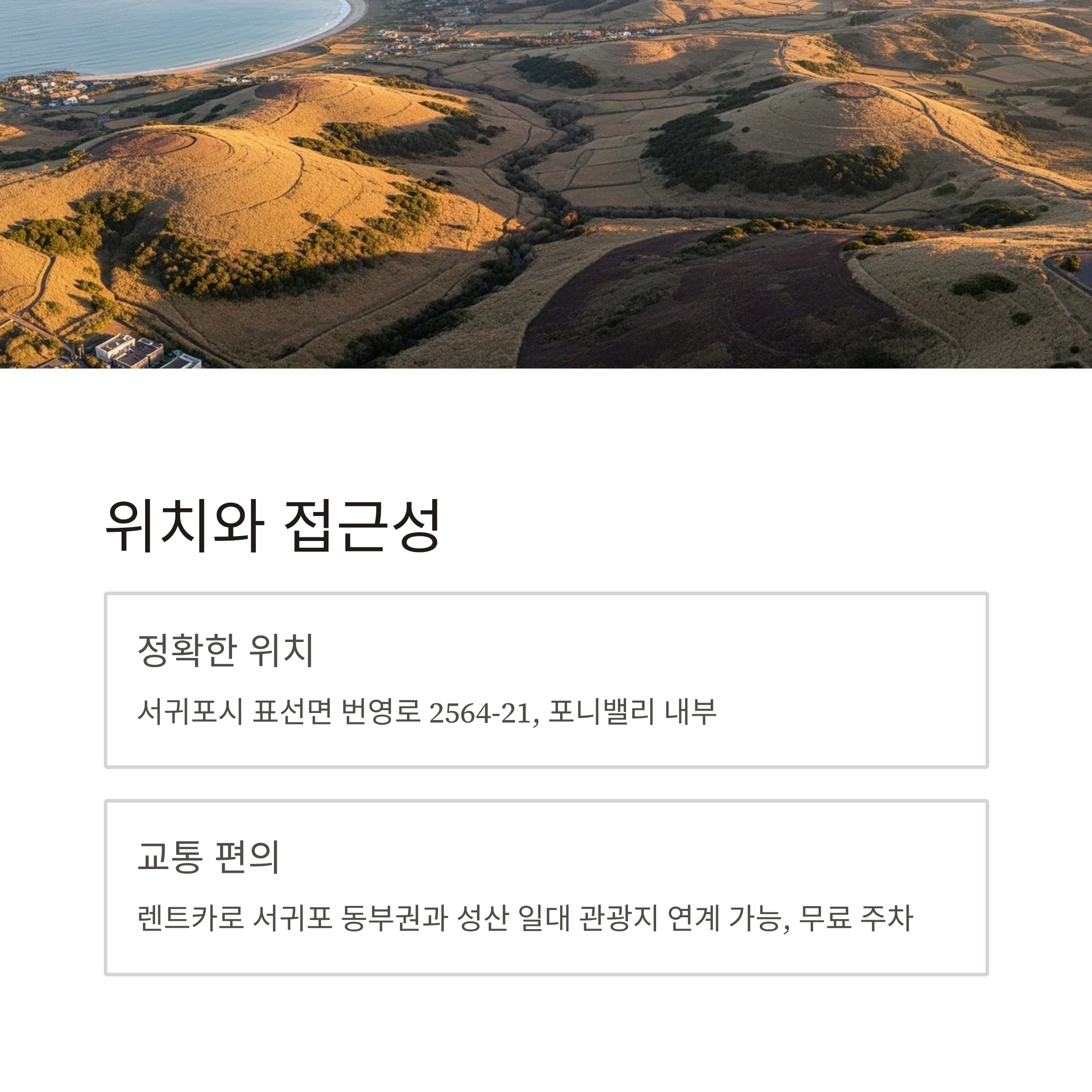 렌트카를 이용하면 서귀포 동부권과 성산 일대 관광지와 연계하기 쉬우며, 주차는 무료로 가능합니다.