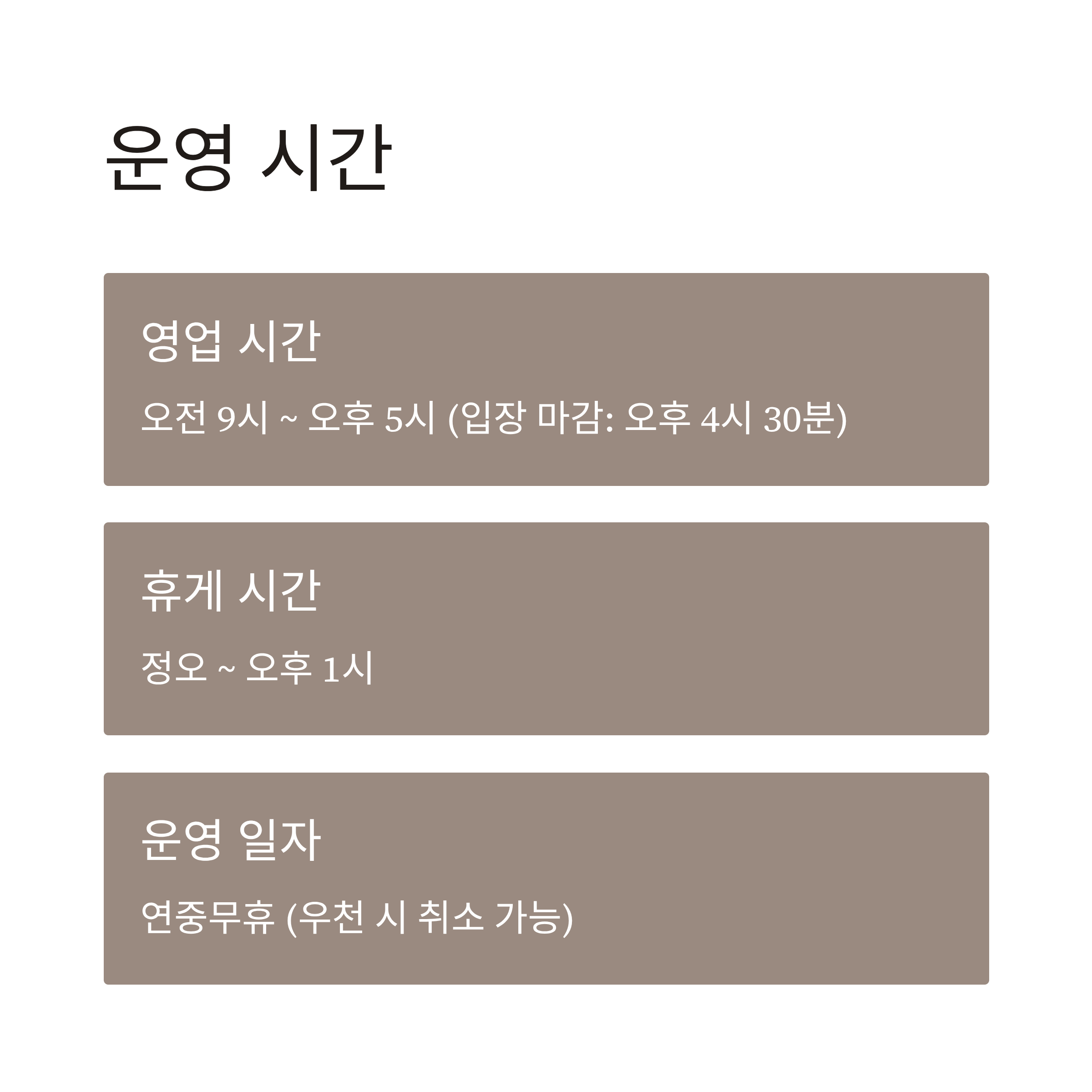 운영 시간은 오전 9시부터 오후 5시까지이며, 입장 마감은 오후 4시 30분입니다.