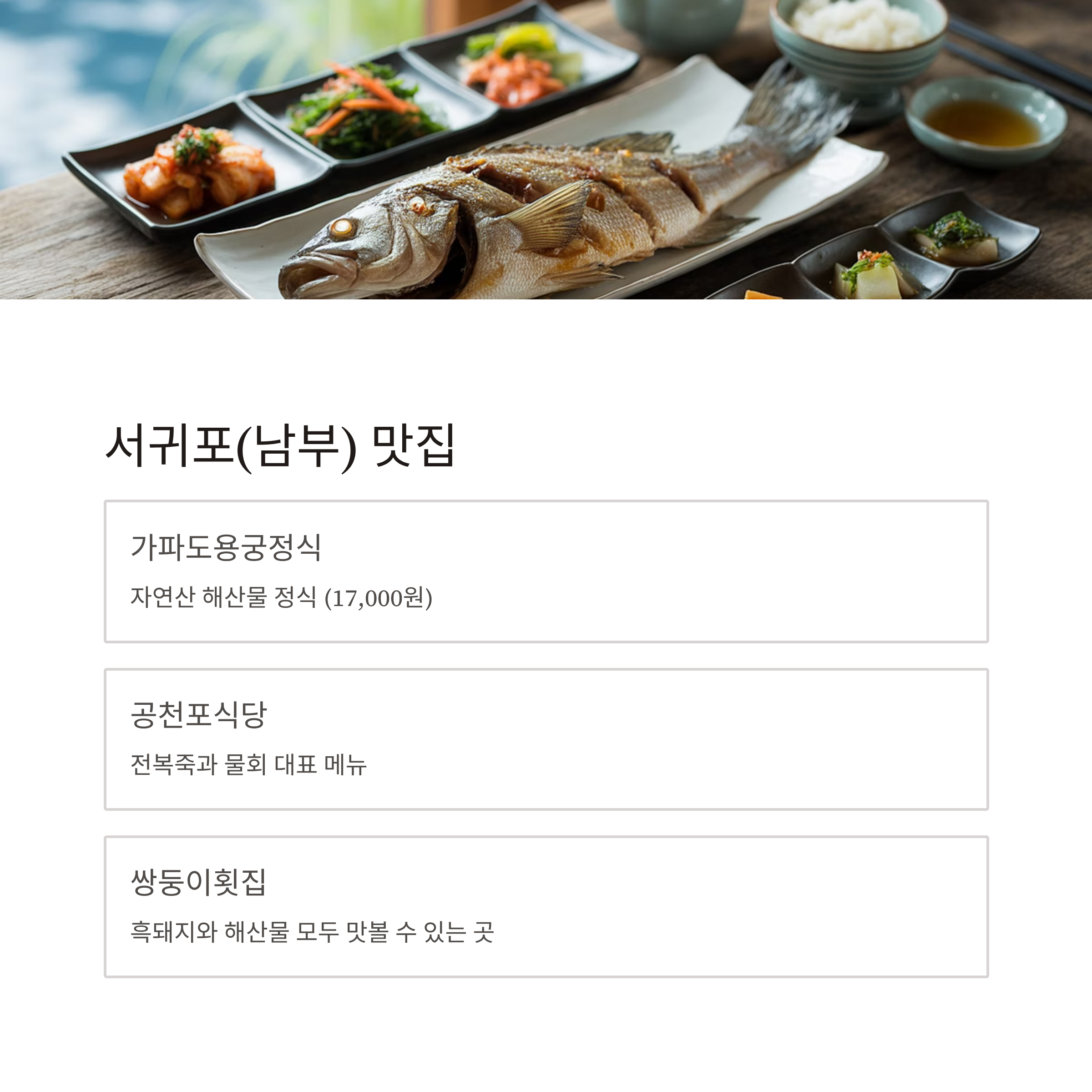 가파도용궁정식은 자연산 해산물이 풍성한 정식(1인 약 17,000원)으로 유명합니다. 공천포식당은 전복죽과 물회가 대표 메뉴이며, 산방식당·쌍둥이횟집·서귀포 백돼지에서는 흑돼지와 해산물을 모두 맛볼 수 있습니다.
