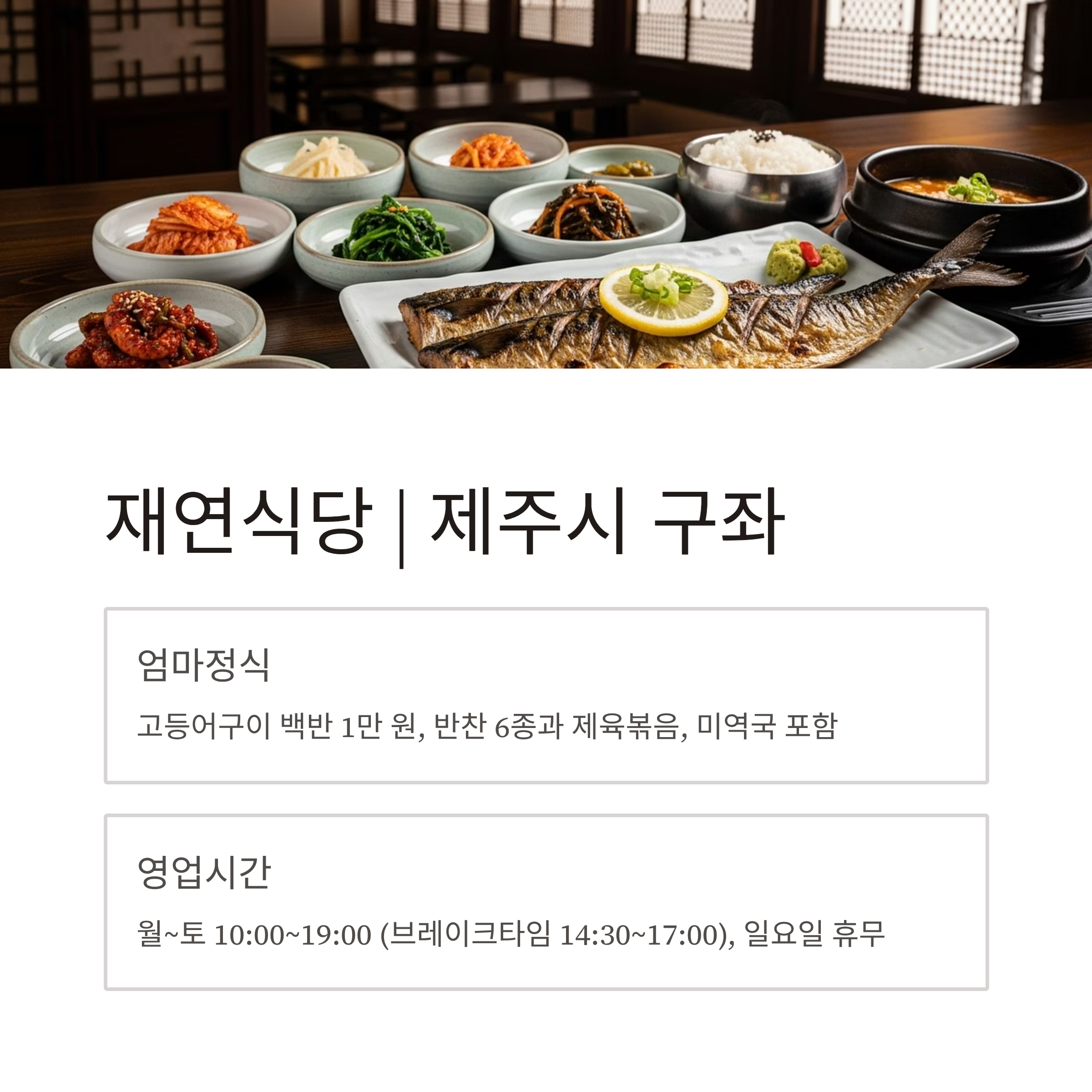| 제주시 구좌 | 재연식당 | 가성비 최고 정식, 반찬·밥 리필 가능 | 고등어 정식 1만 원 |