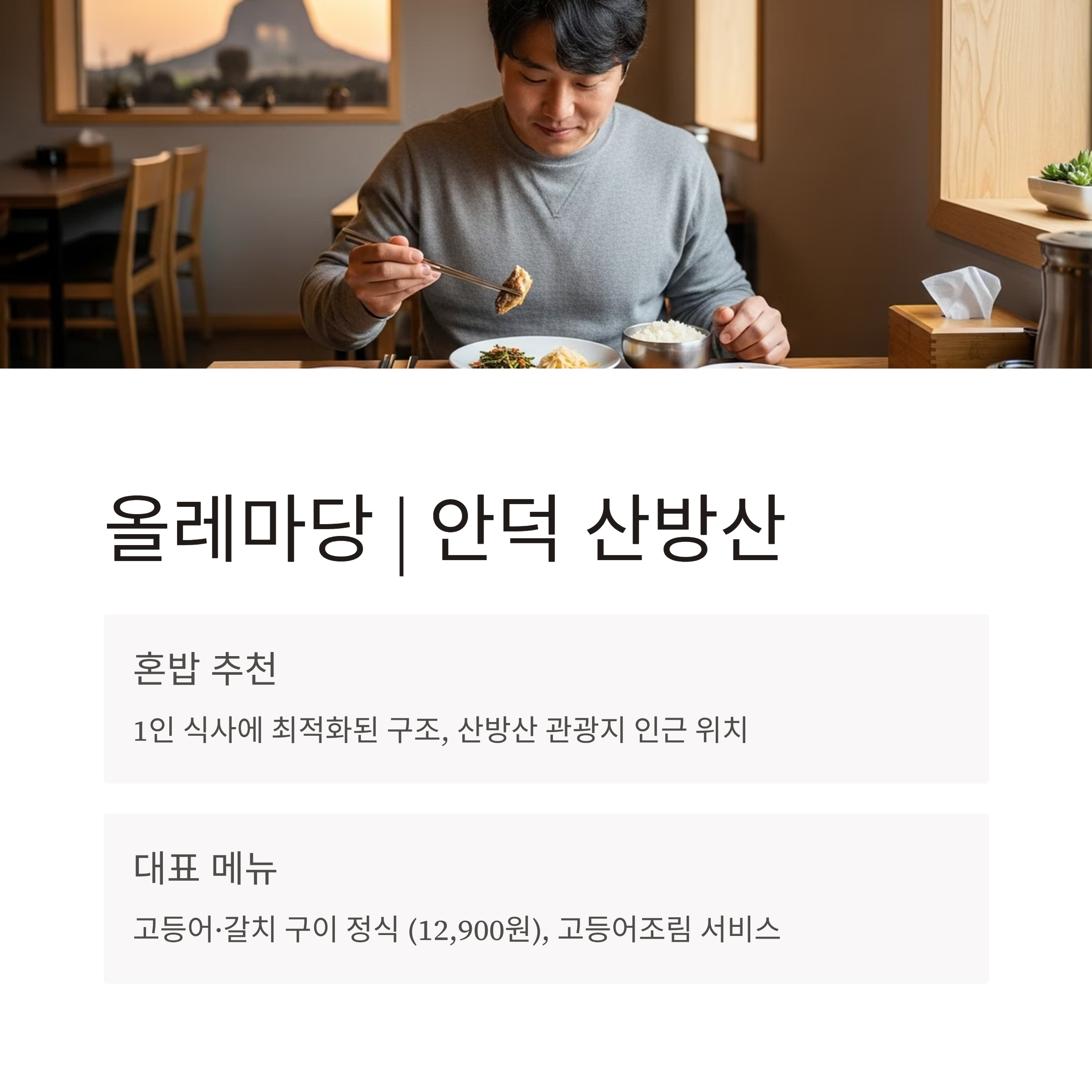 | 안덕 산방산 근처 | 올레마당 | 혼밥 가능 구조, 관광지 인근 소형 식당 | 생선구이 정식 1만2900원 |