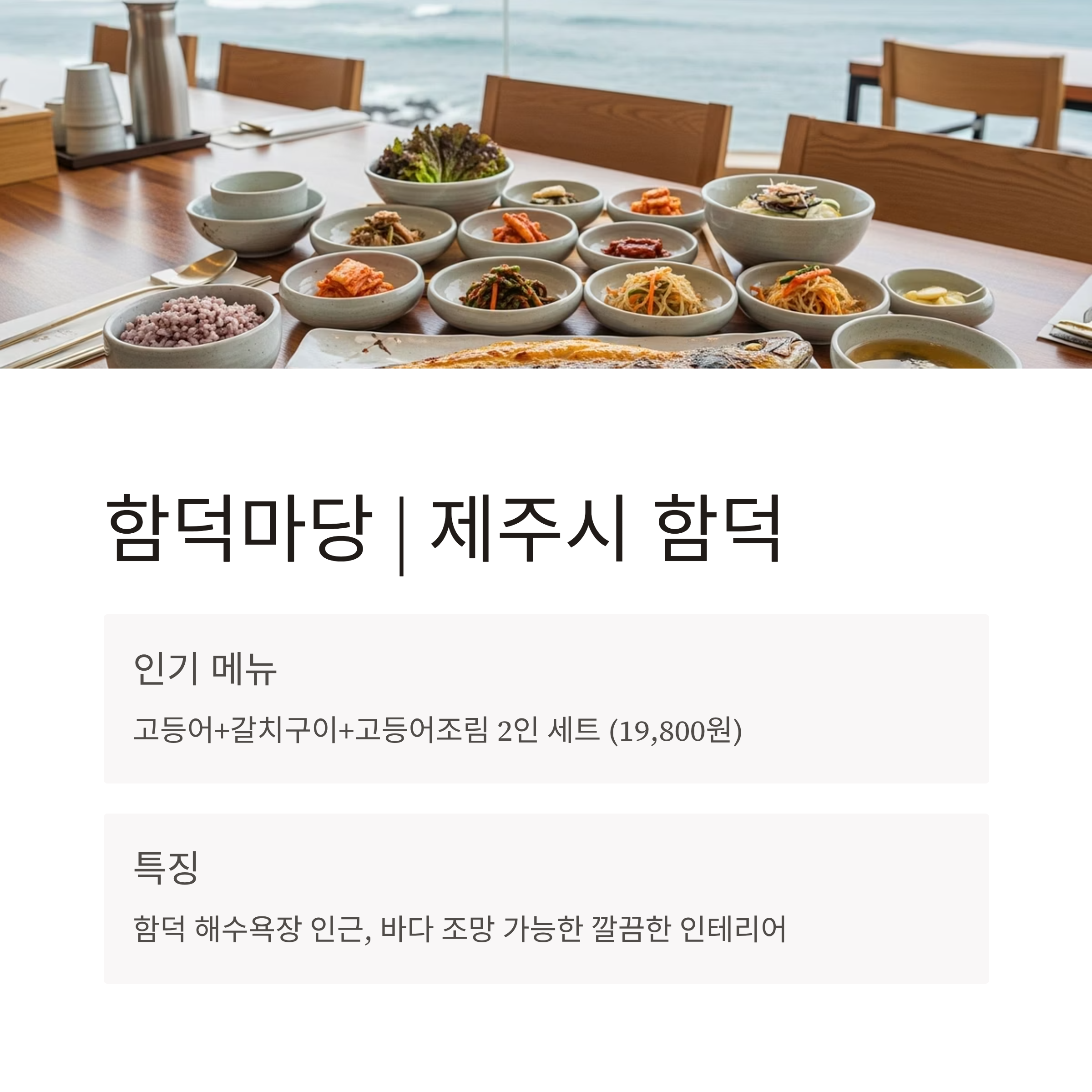 | 제주시 함덕 | 함덕마당 | 모둠 세트 인기, 바다 뷰 식당 | 2인 세트 1만9800원 |