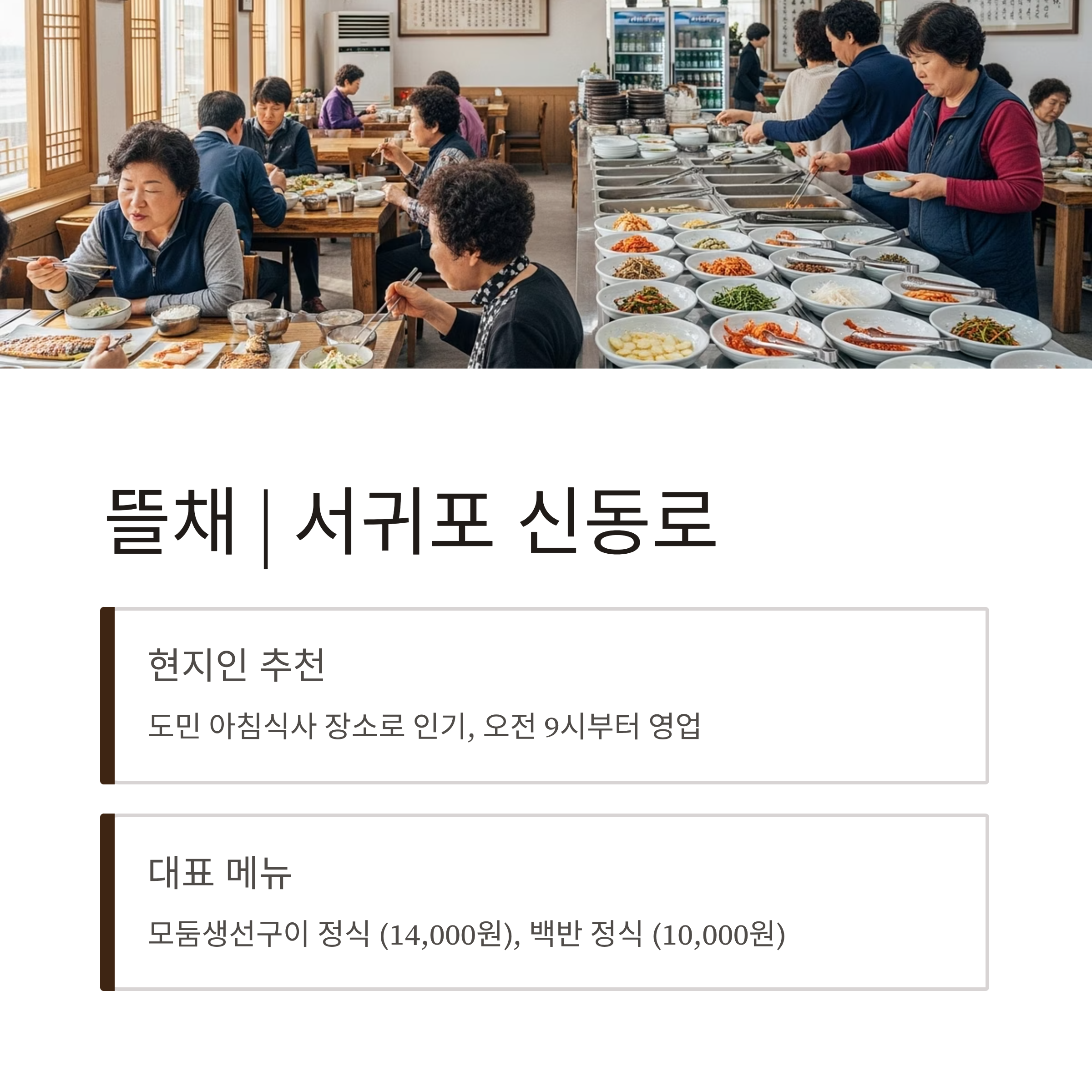 | 서귀포 신동로 | 뜰채 | 현지인 애정 식당, 아침 식사도 가능 | 모둠구이 정식 1만4천 원 |