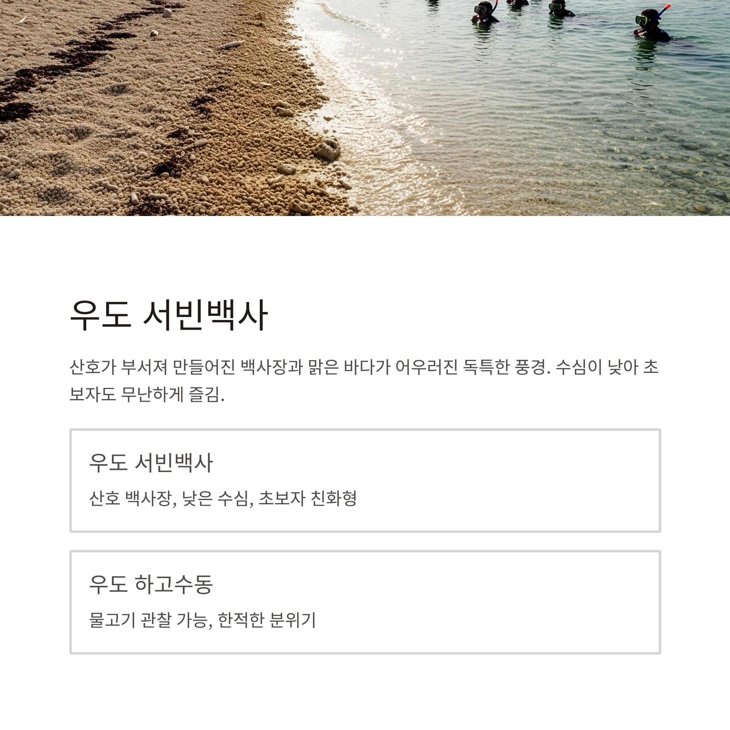 | 우도 서빈백사 | 산호 백사장, 낮은 수심, 초보자 친화형 |