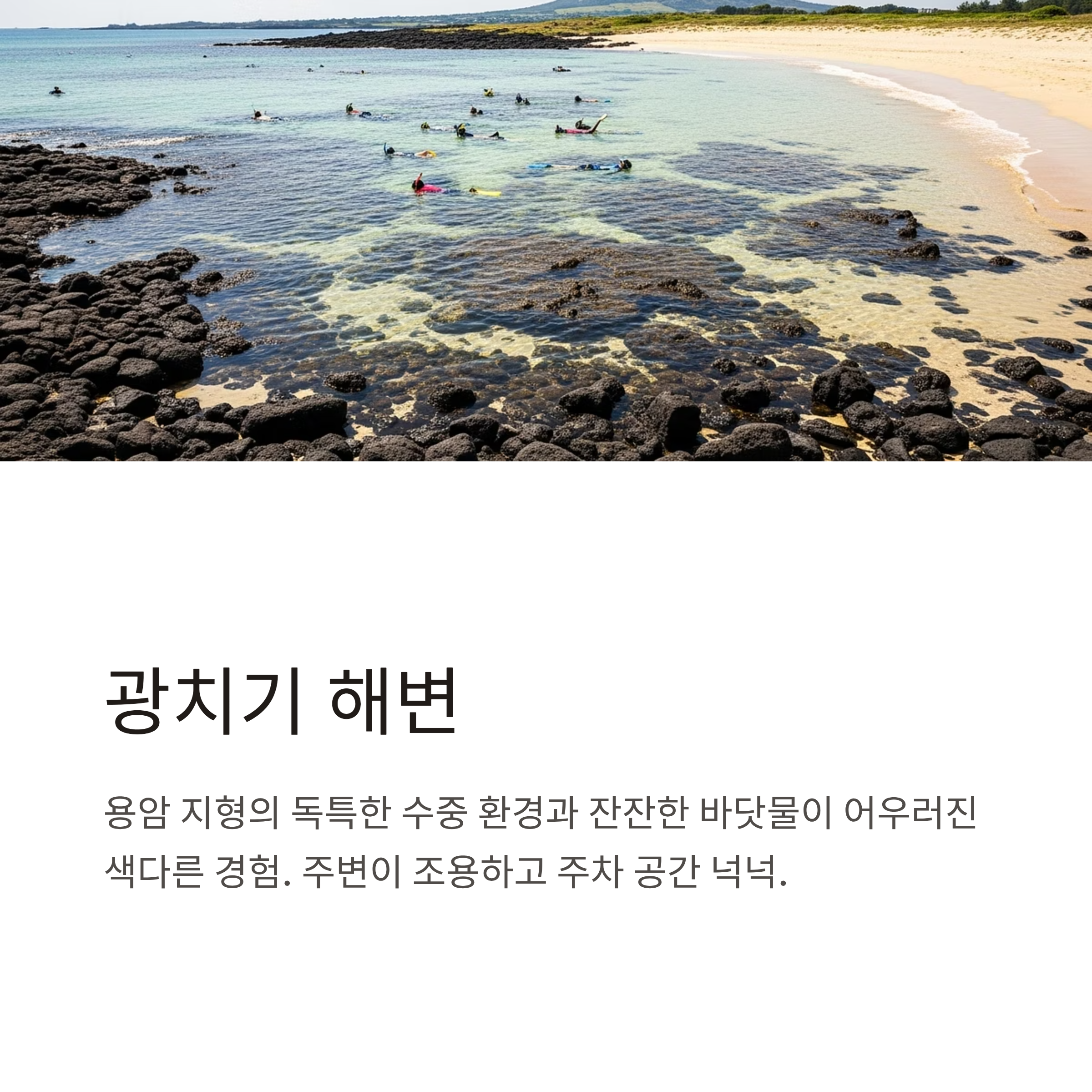 스노클링 체험업체와 장비 대여소도 근처에 있어 접근성과 편의성 모두 우수합니다.