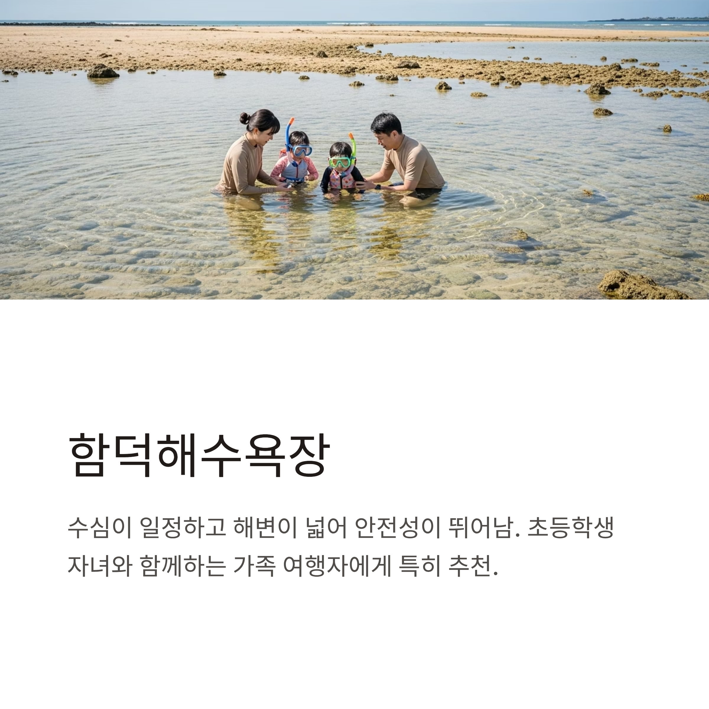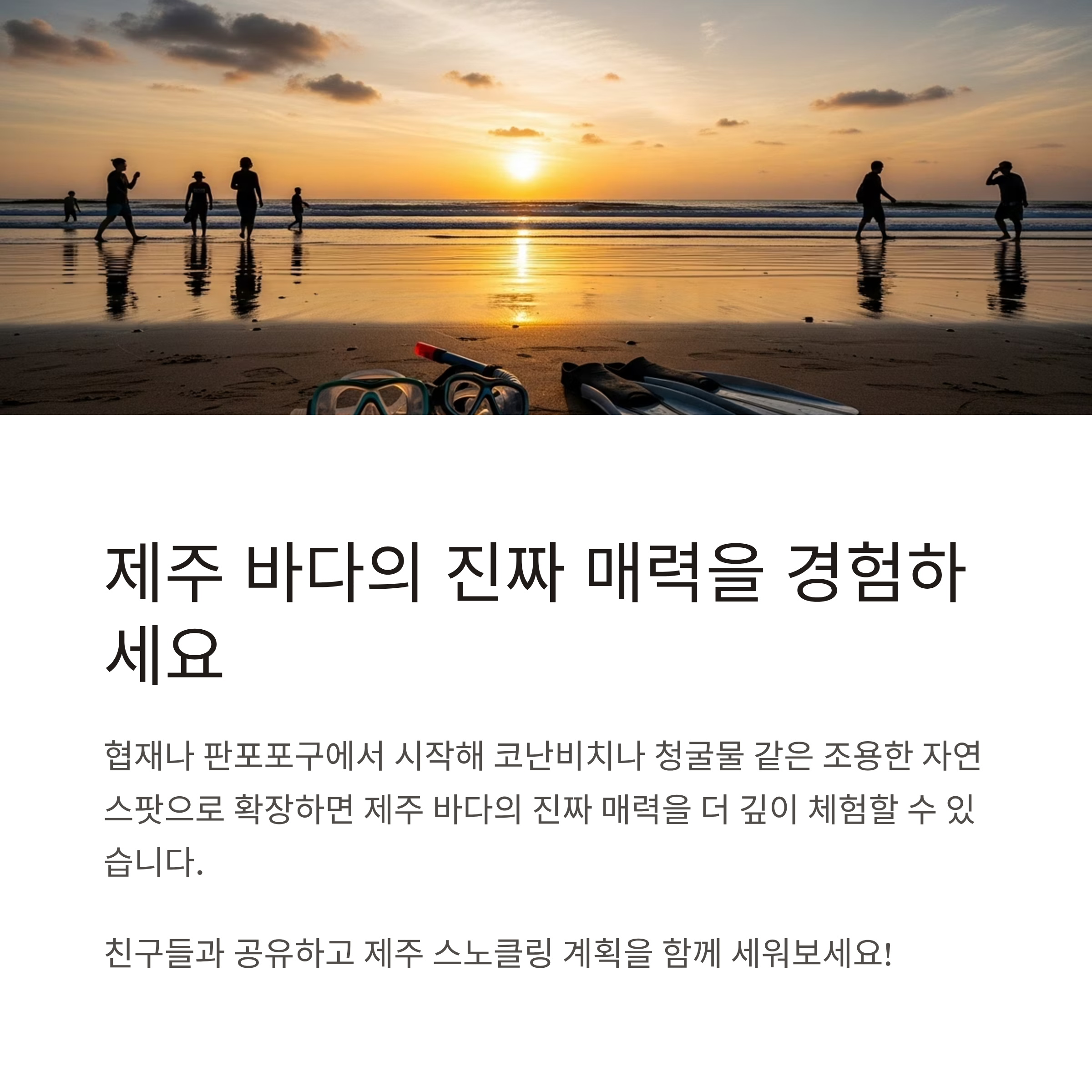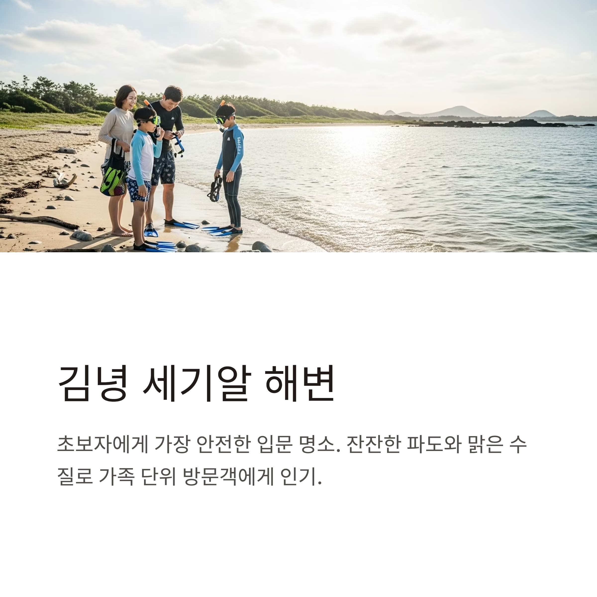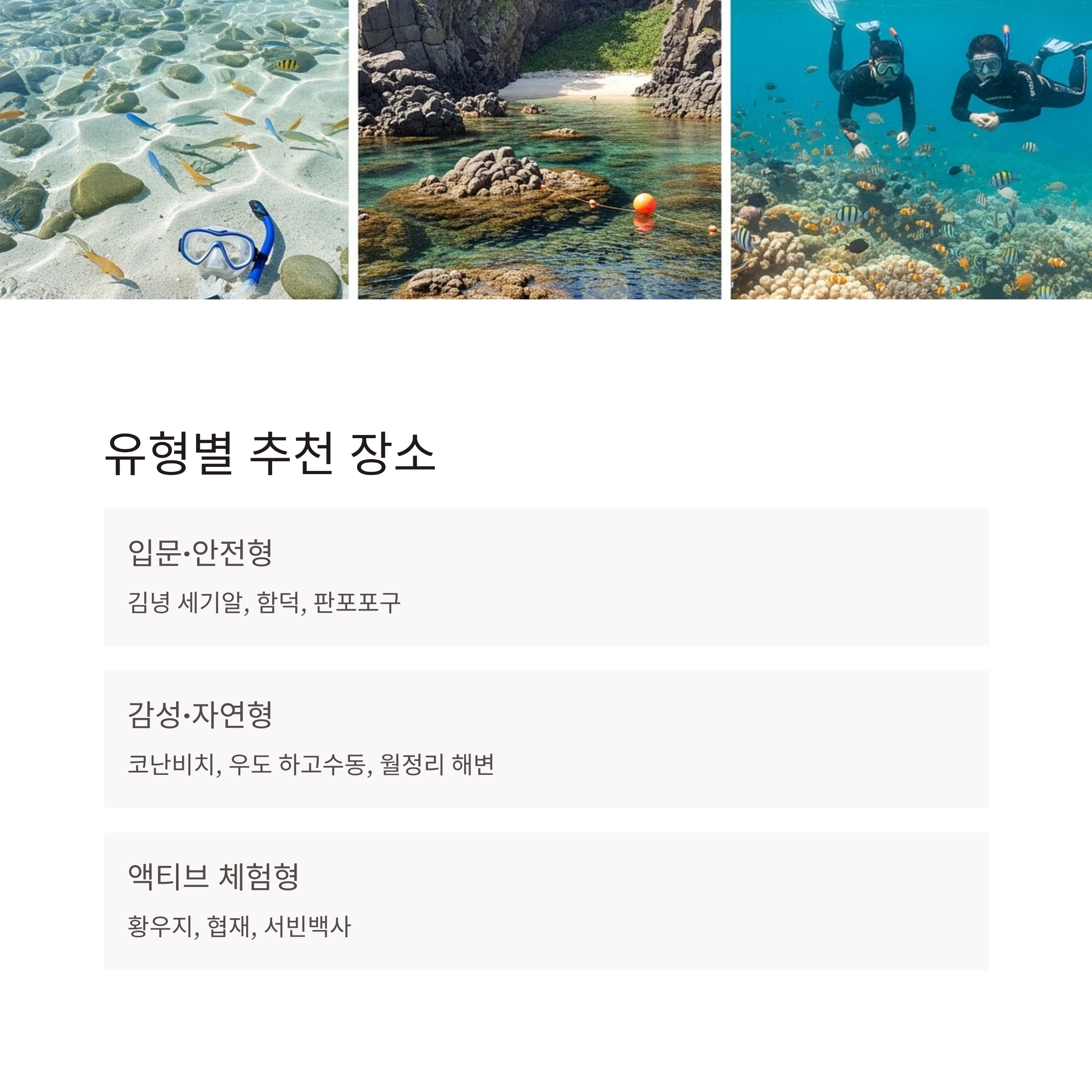 | 입문·안전형 | 김녕 세기알, 함덕, 판포포구 | 얕은 수심, 초보자 친화, 안전요소 우수 |