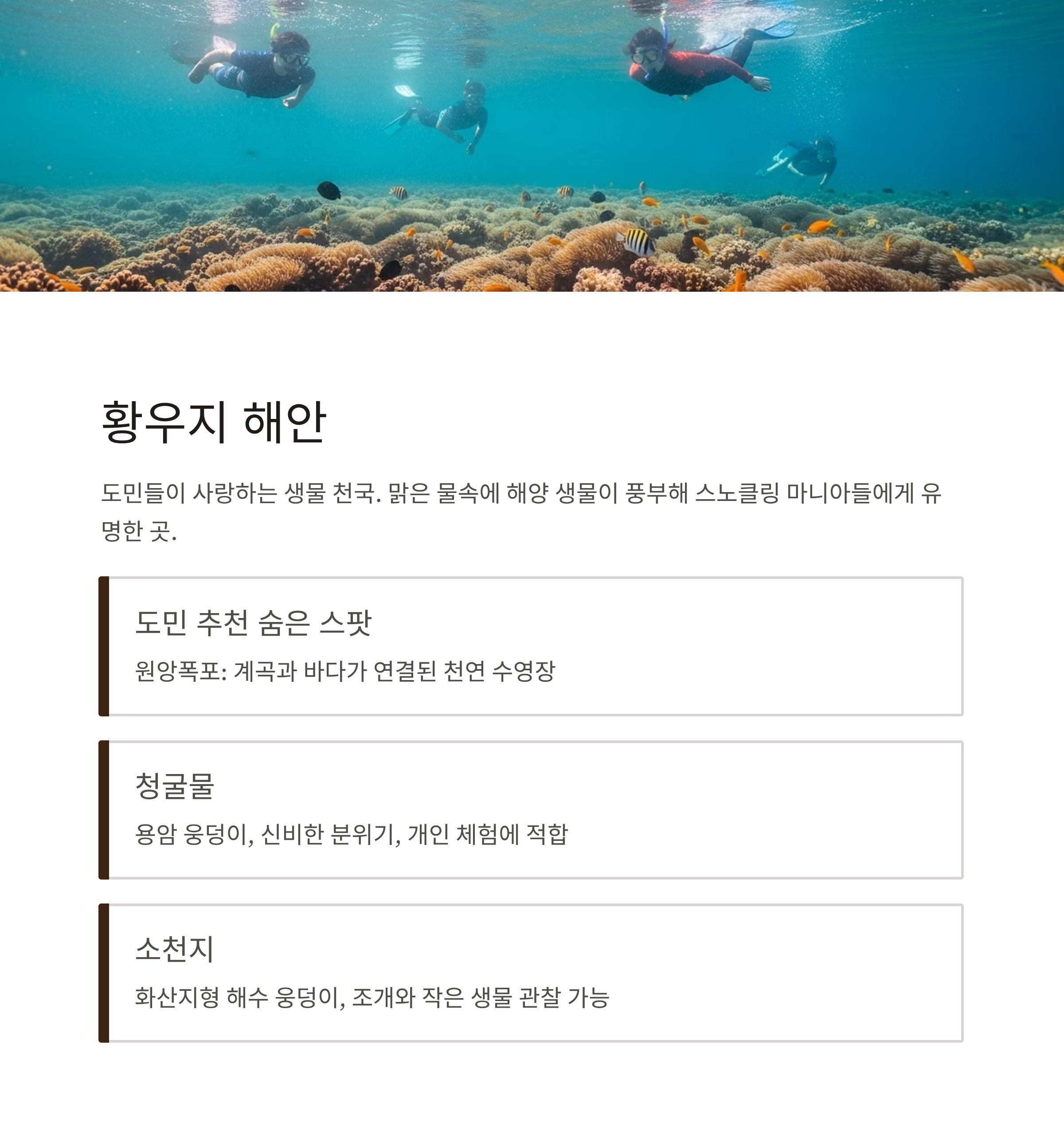 | 액티브 체험형 | 황우지, 협재, 서빈백사 | 다양한 생물 관찰 가능, 체험 중심 여행자에게 적합 |