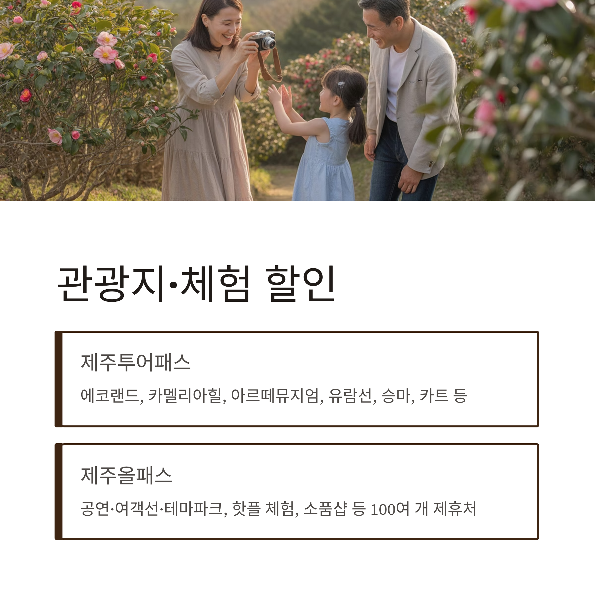 - 제주올패스: 공연·여객선·테마파크, 핫플 체험, 소품샵 등 100여 개 제휴처
