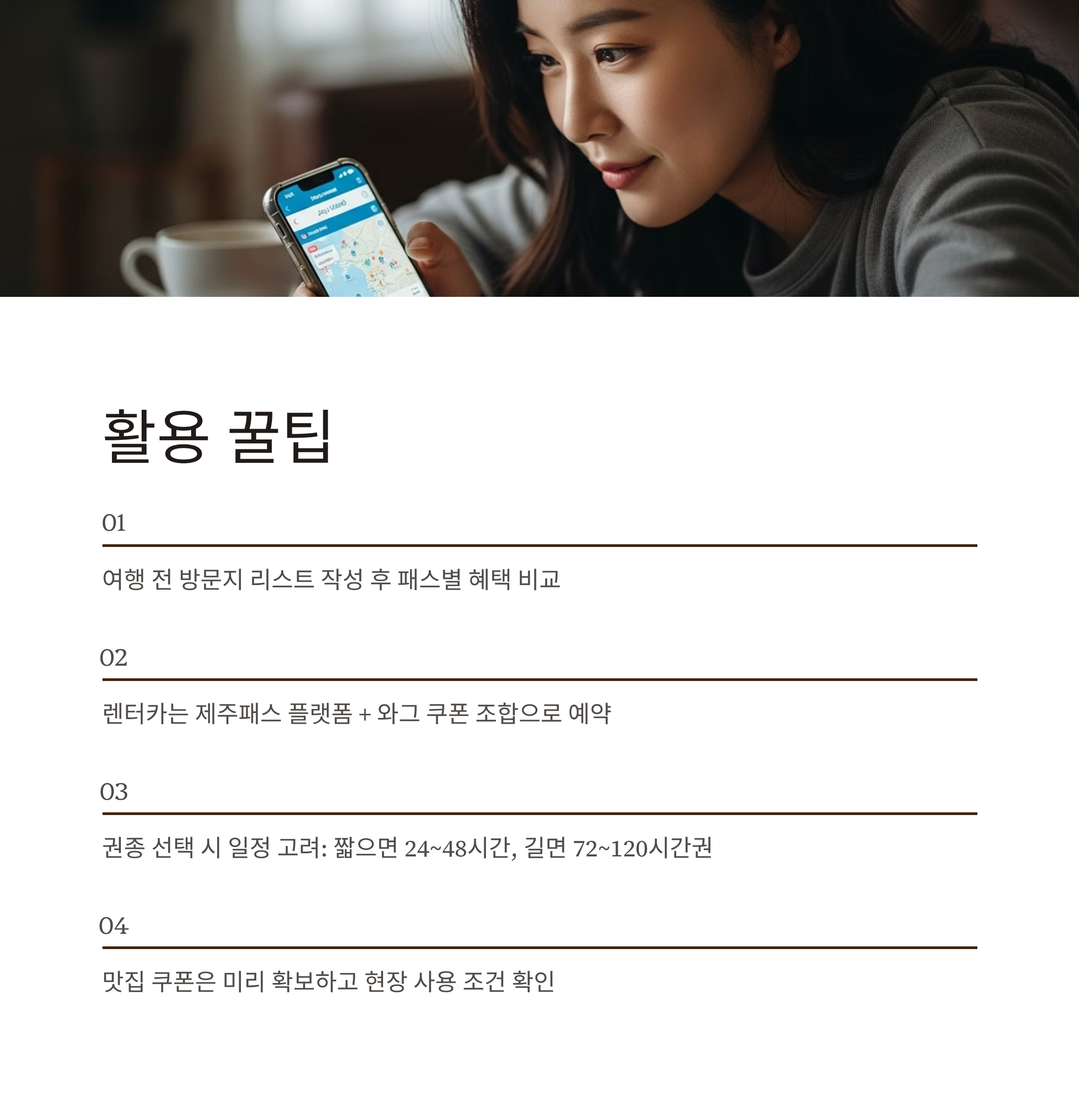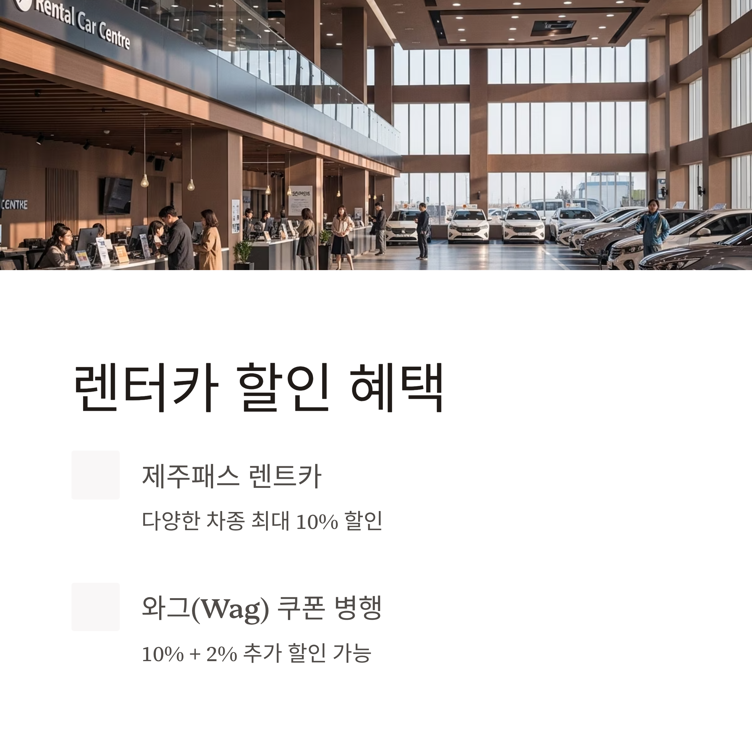 - 렌터카는 제주패스 플랫폼 + 와그 쿠폰 조합으로 예약