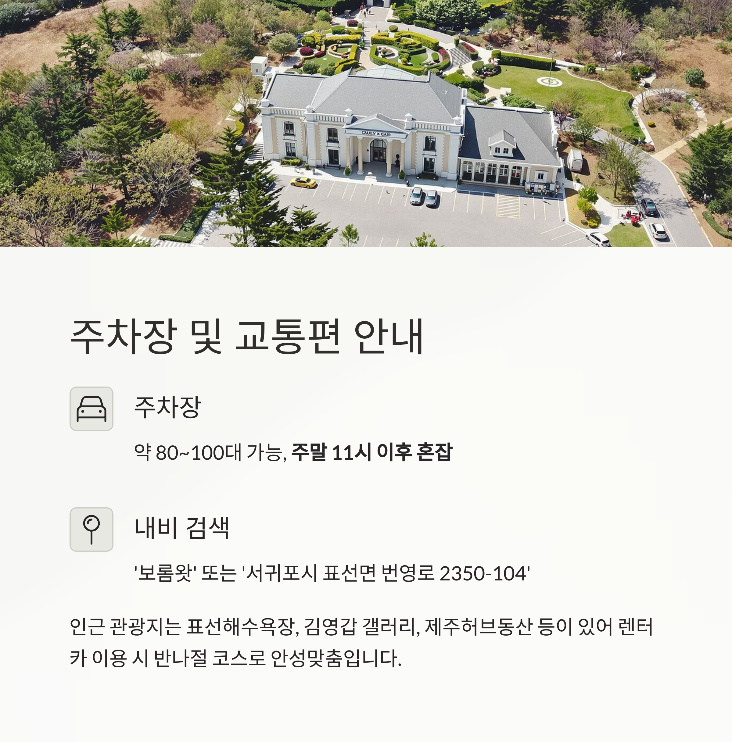 | 자차 내비 검색 | ‘보롬왓’ 또는 ‘서귀포시 표선면 번영로 2350-104’ 입력 |