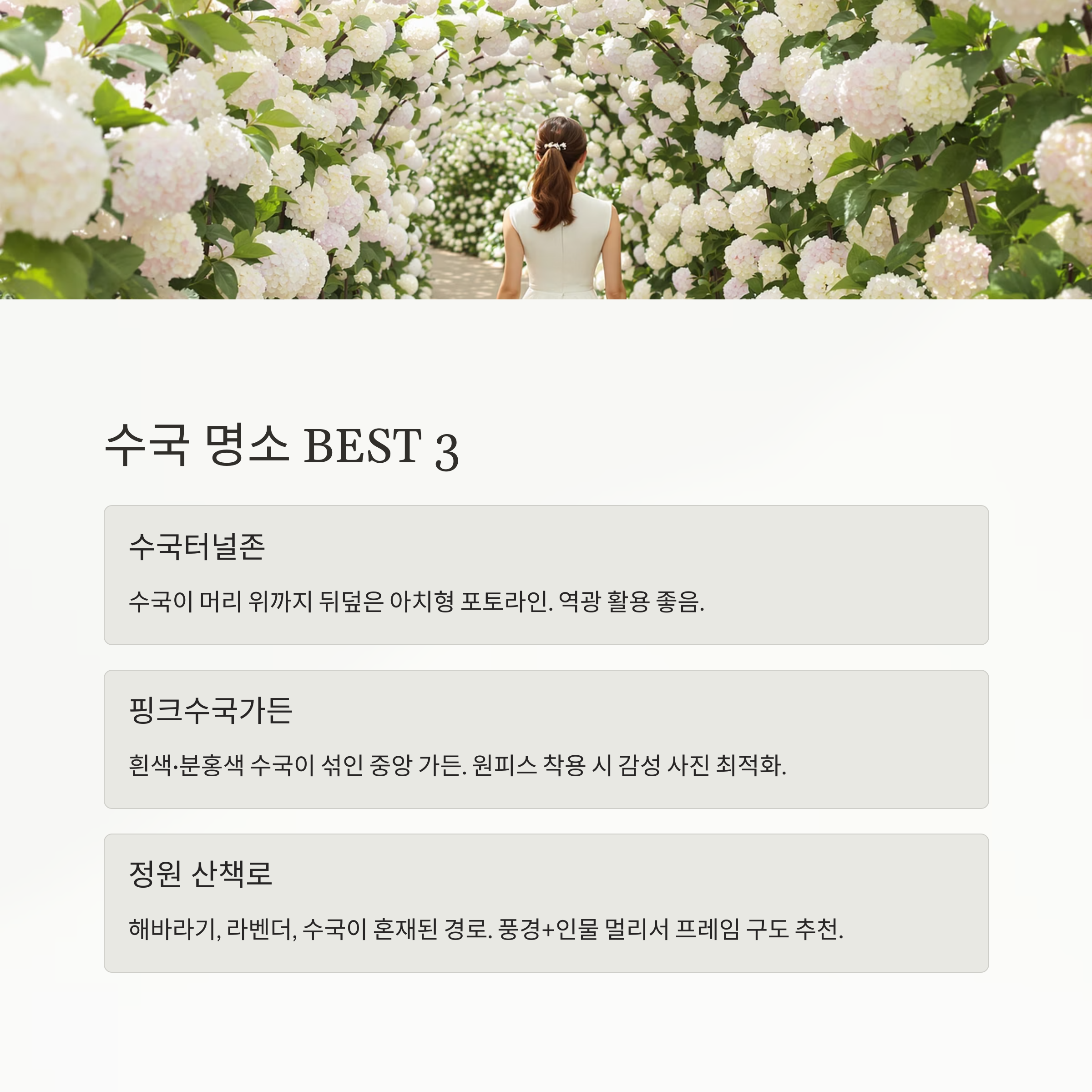 | 수국터널존 | 수국이 머리 위까지 뒤덮은 아치형 포토라인 | 인물 + 뒷모습 중심 구도, 역광 활용 좋음 |