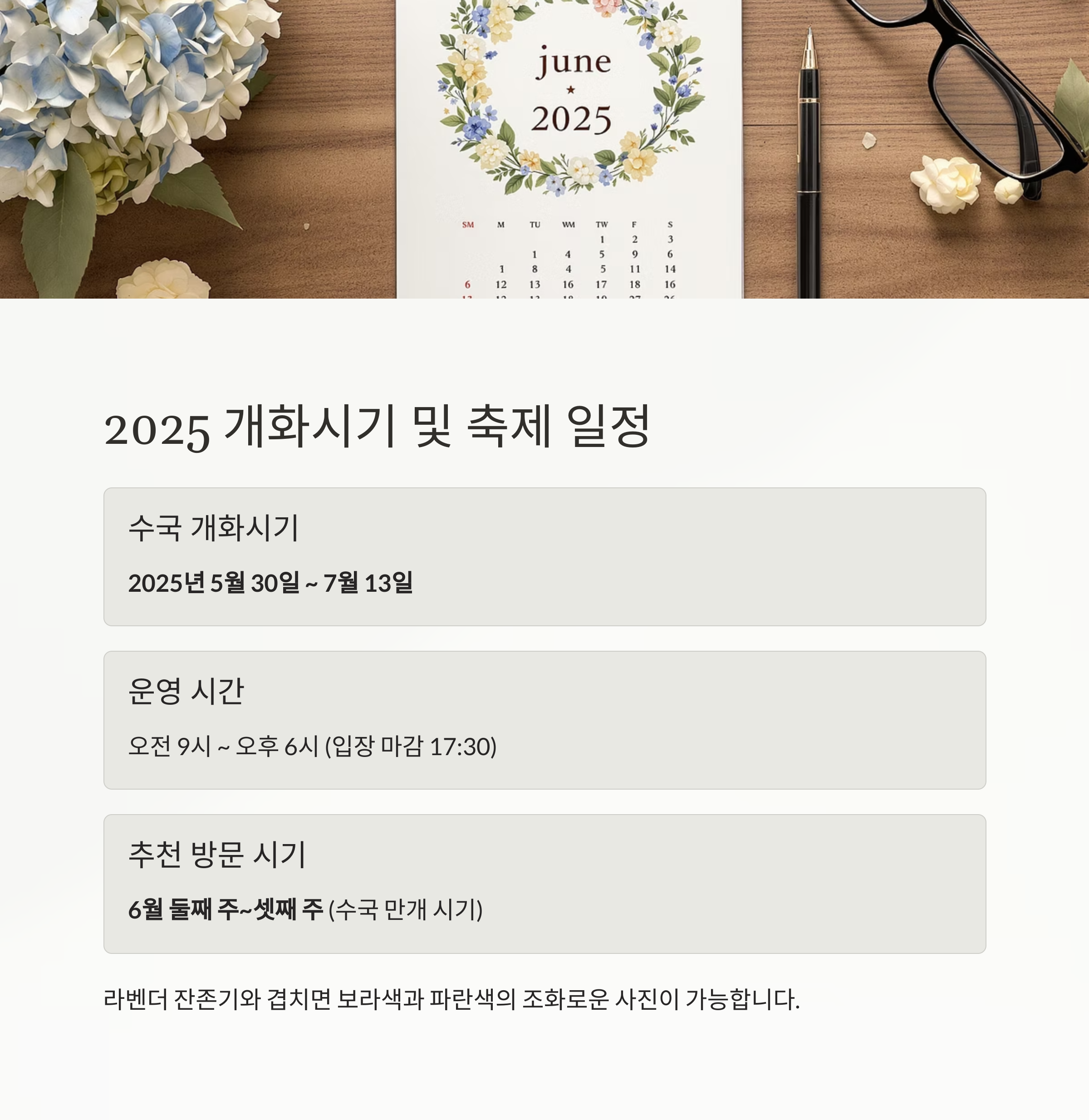 | 수국 개화시기 | 2025년 6월 초 ~ 7월 중순 (날씨 따라 차이 있음) |