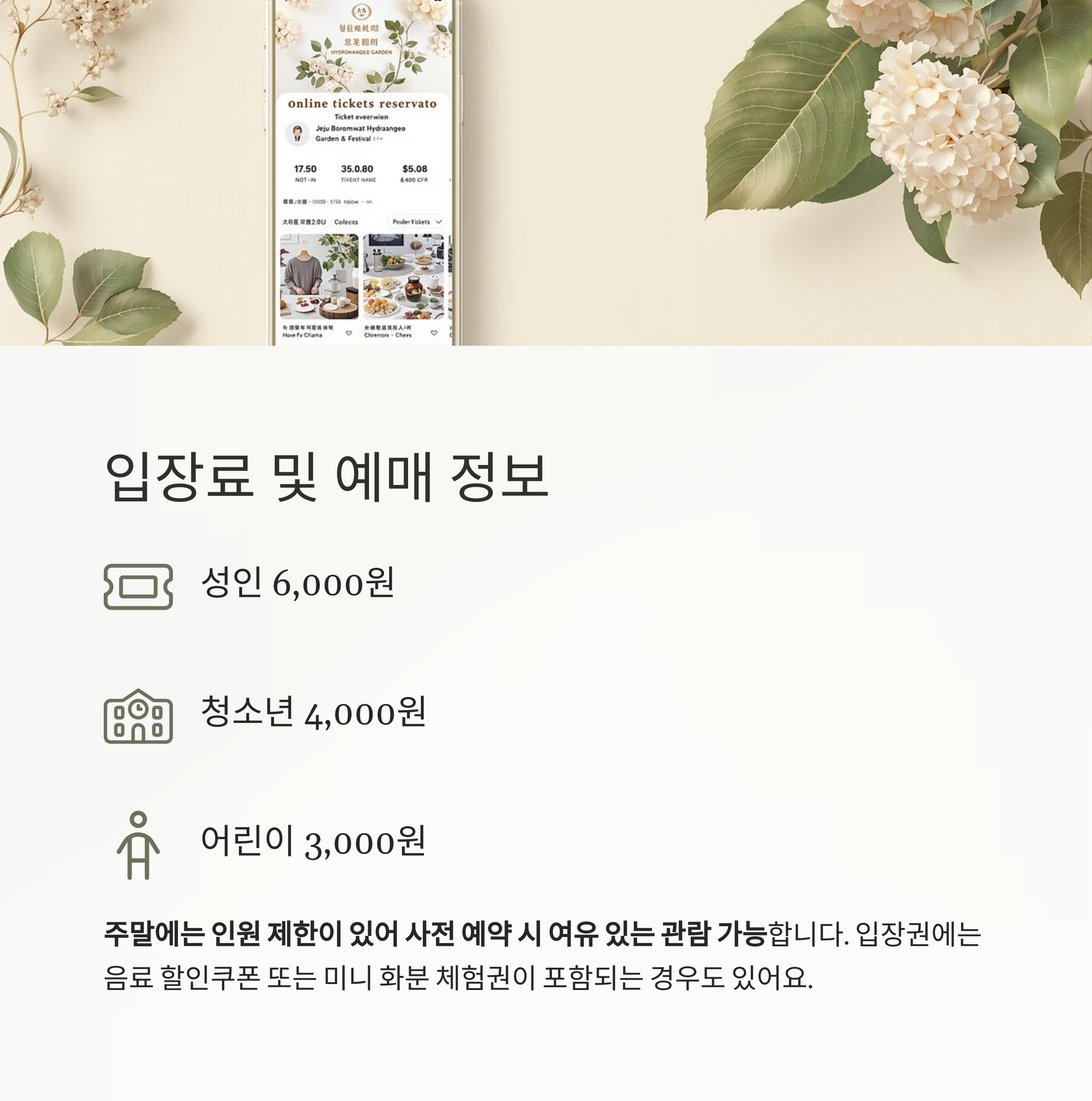 입장권에는 음료 할인쿠폰 또는 미니 화분 체험권이 포함되는 경우도 많으므로
