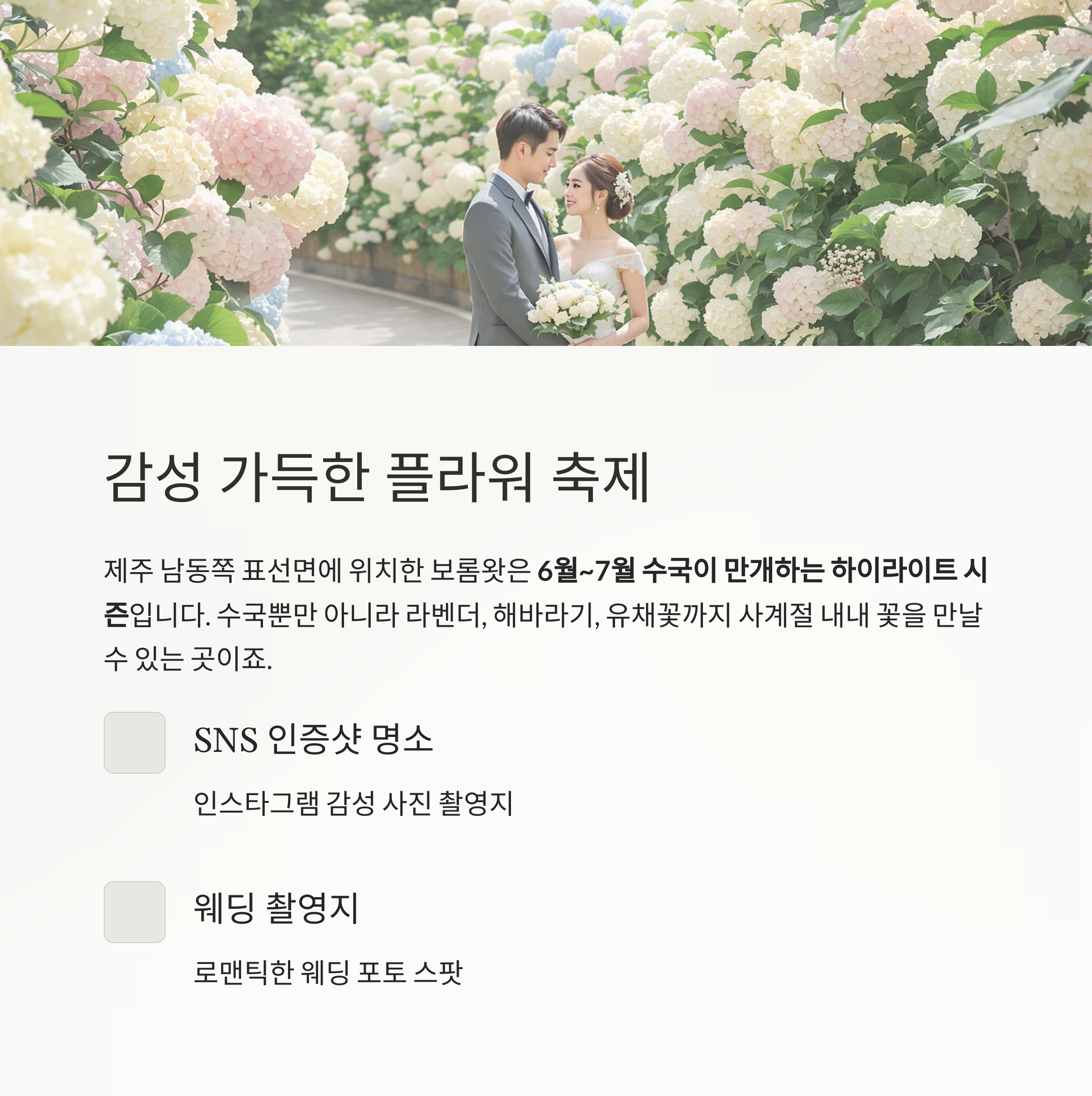 | 핑크수국가든 | 흰색·분홍색 수국이 섞인 중앙 가든 | 원피스 착용 시 감성 사진 최적화 |