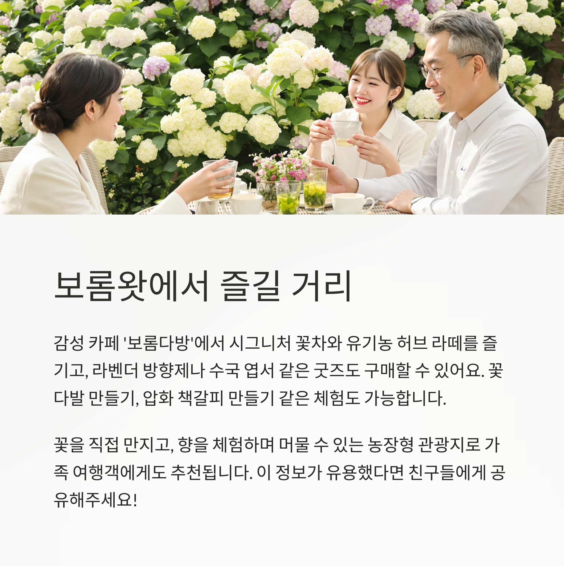 - 감성 카페 ‘보롬다방’: 시그니처 꽃차, 유기농 허브 라떼 인기