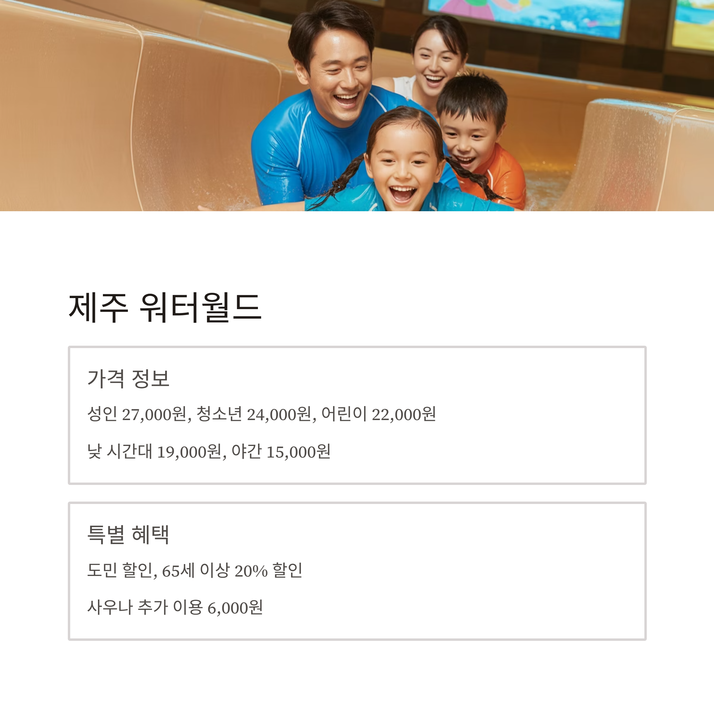| 제주 워터월드 | 27,000원 | 도민·65세 할인, 시간대별 할인, 사우나 연계 할인 | 실내 미디어 아트 테마, 사우나 가능 |
