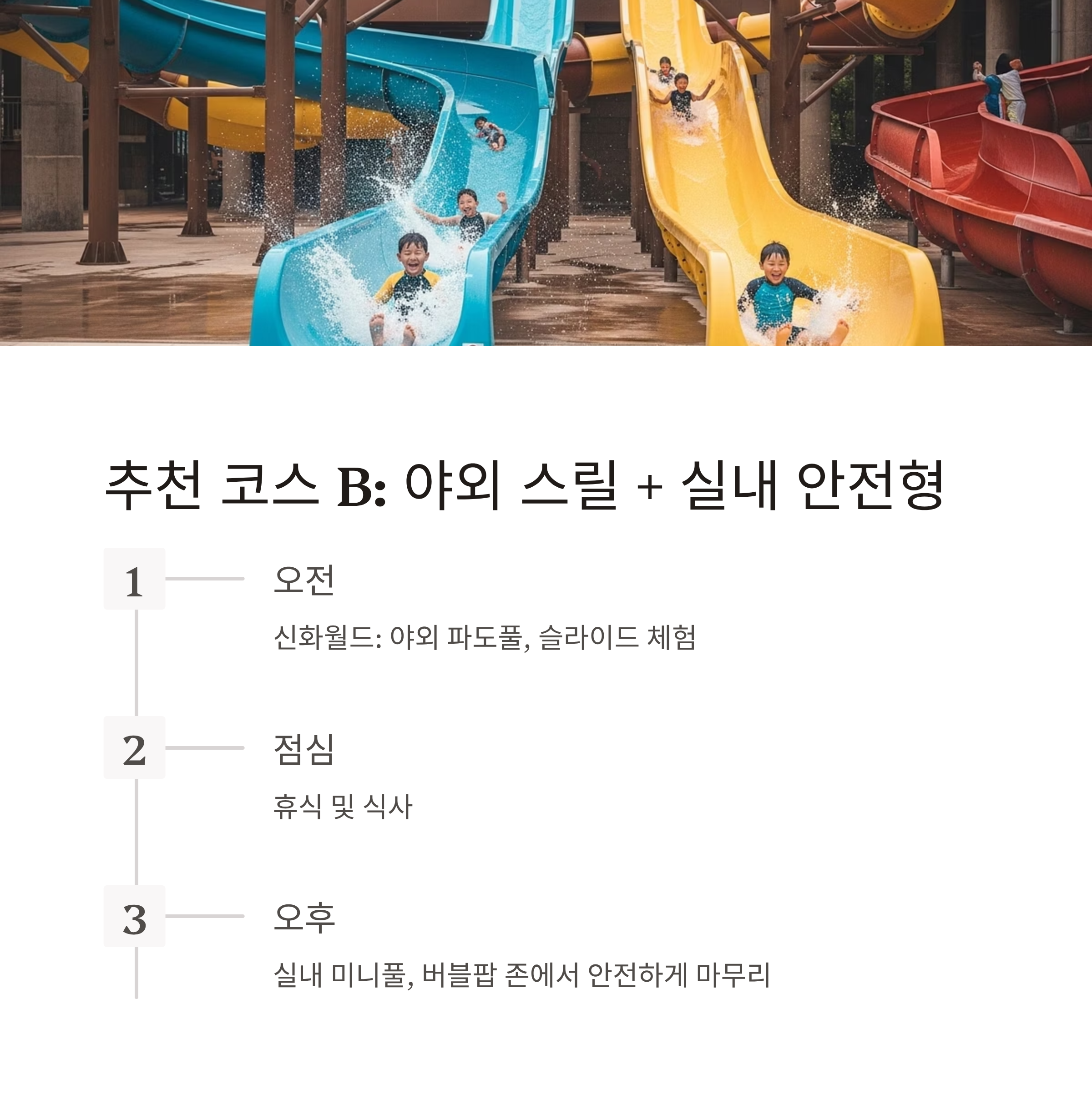 오전에는 신화월드 야외 어트랙션에서 파도풀과 슬라이드를 즐기고, 오후에는 실내로 이동해 어린이를 위한 미니풀과 버블팝 존에서 안전하게 마무리합니다. 활동량이 많은 아이들에게 적합한 코스입니다.