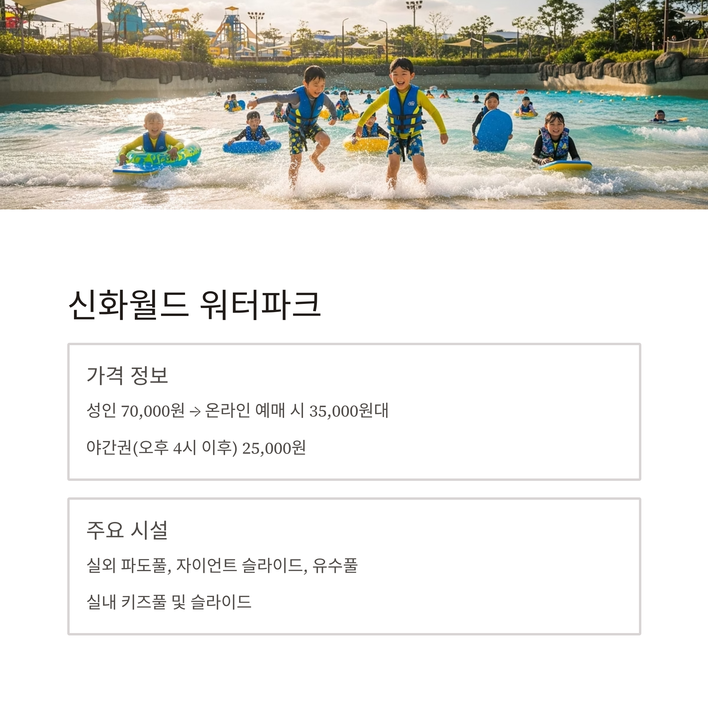 | 신화월드 워터파크 | 70,000원 → 35,000원대 가능 | 야간권, 네이버·와그 예매, 카드 제휴 할인 | 실내·야외 모두 갖춘 대형 종합 워터파크 |