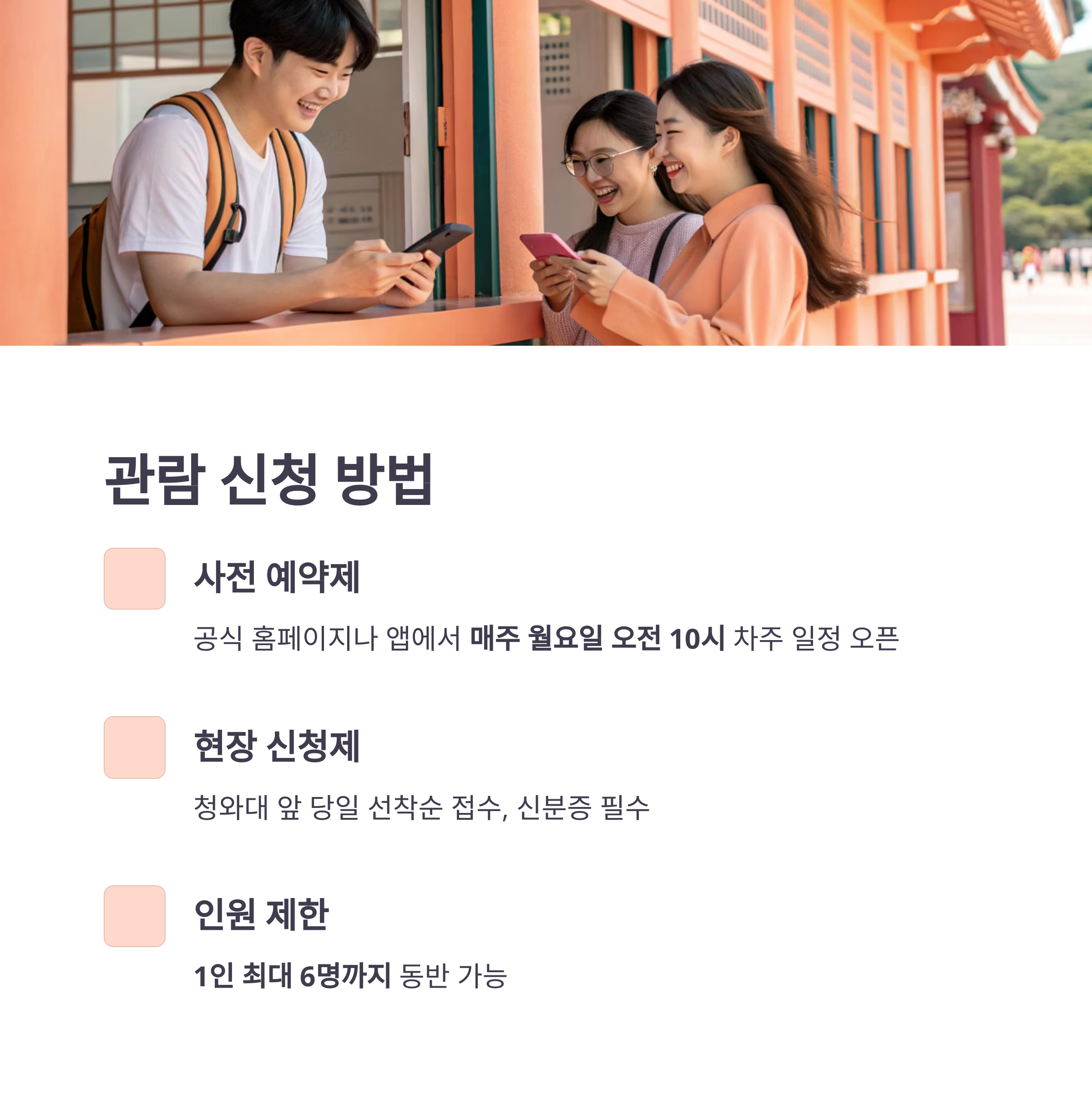 사전 예약은 공식 홈페이지 또는 모바일 앱(청와대 관람신청)에서 가능하며