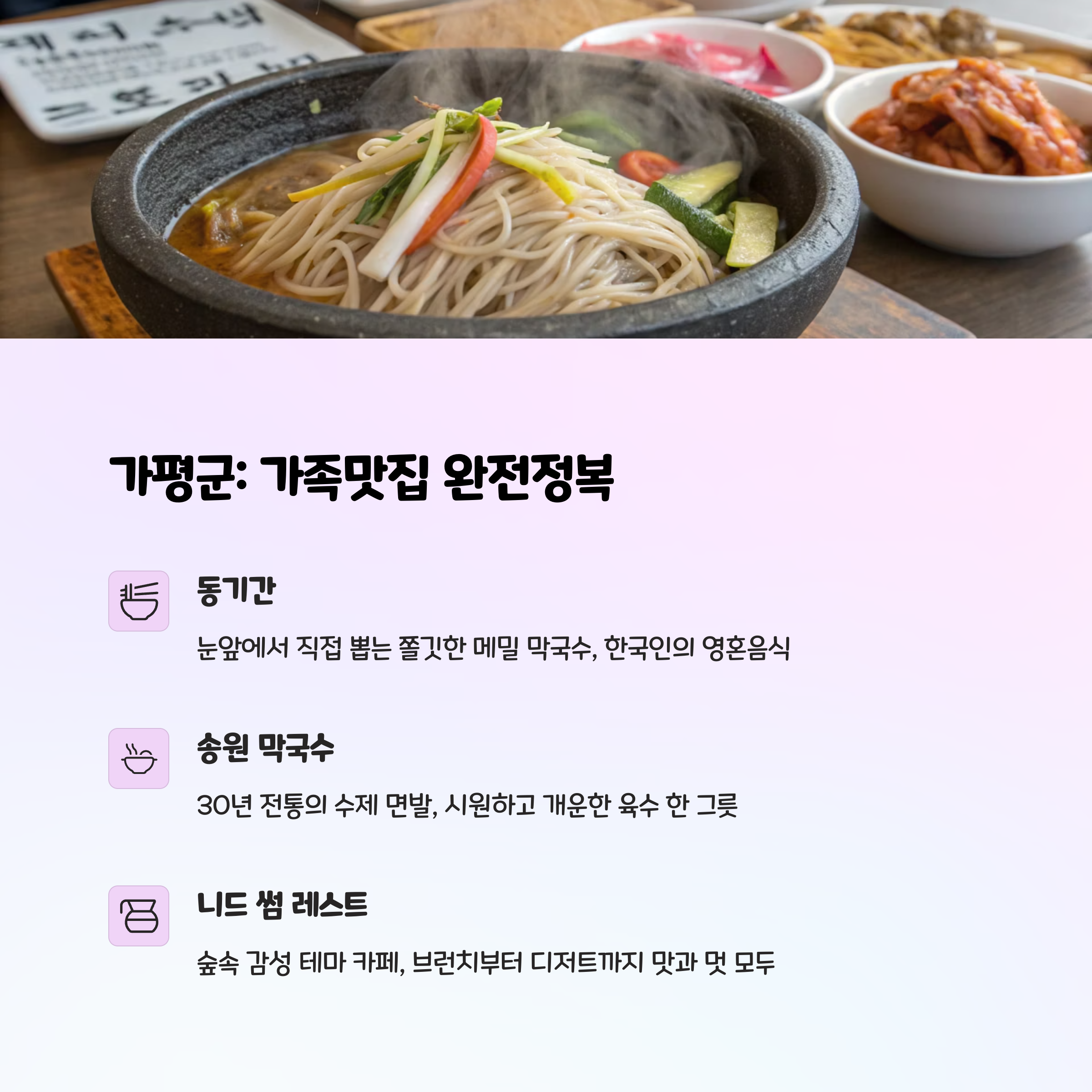 | 가평 | 아침 고요 수목원 | 자연 & 테마파크 | 닭볶음탕 & 막국수 |