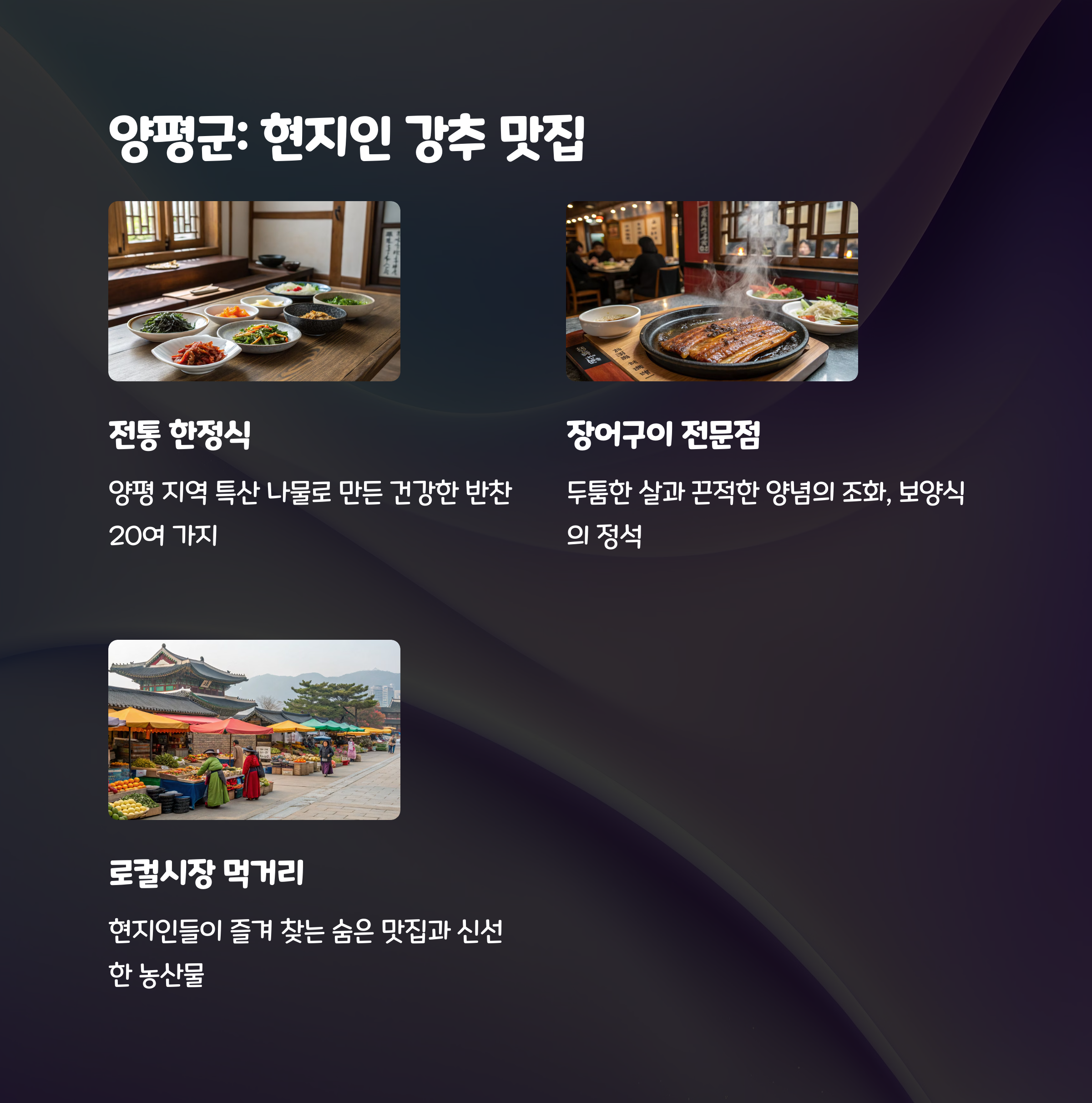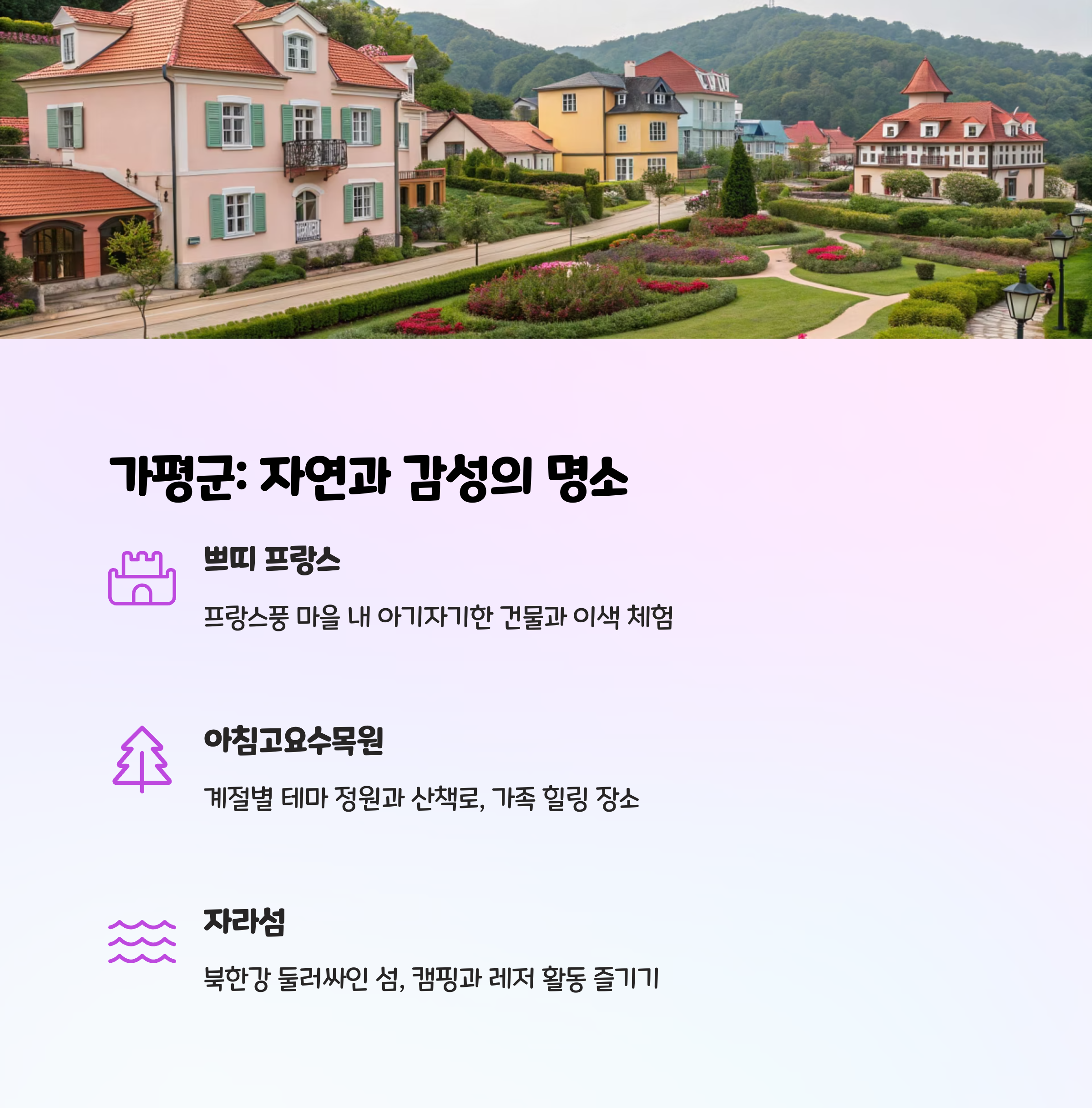가평, 양평, 제주 각각의 코스는 모두 각기 다른 매력을 제공합니다.