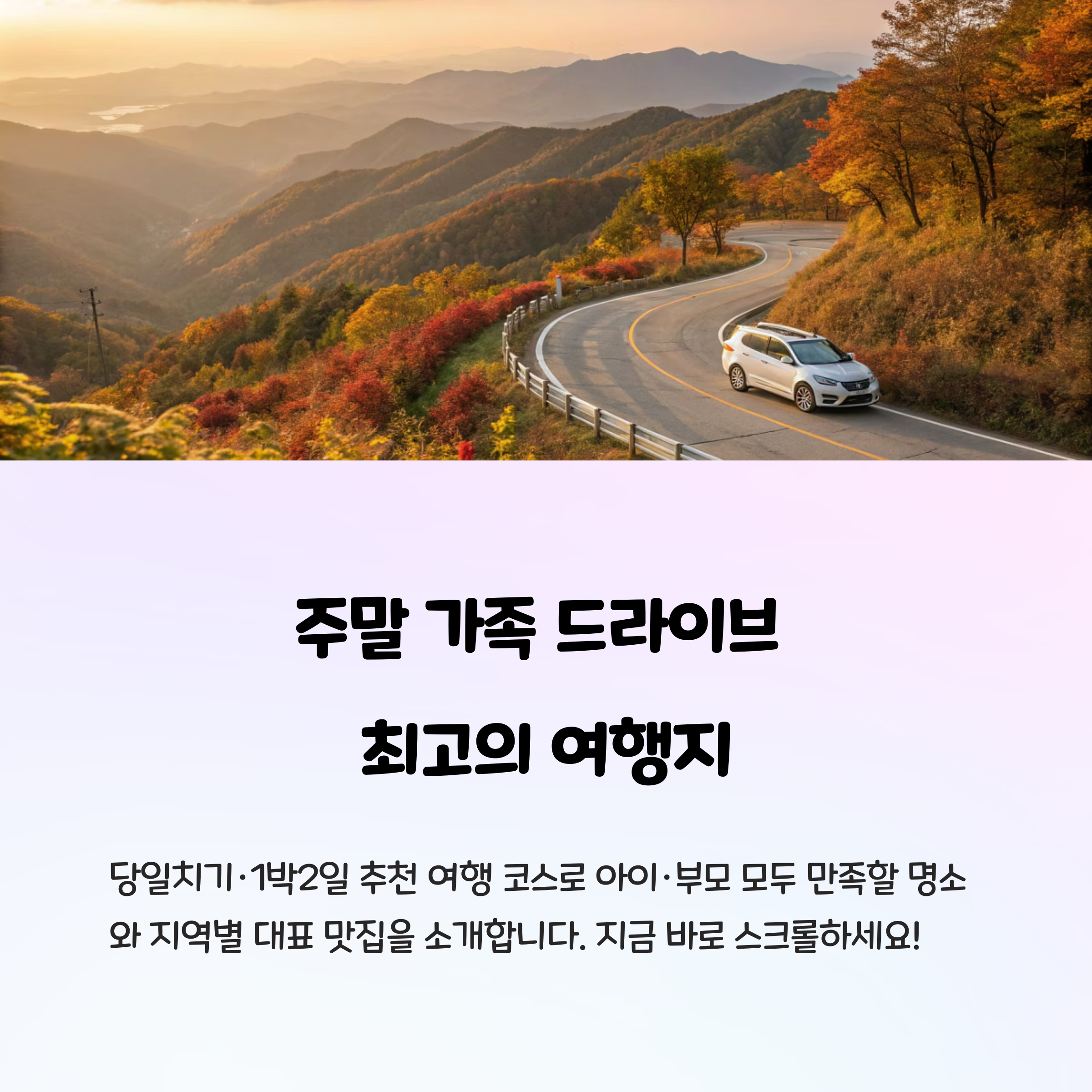 오늘은 가족과 함께 소중한 추억을 만들 수 있는 주말 드라이브 여행 코스를 준비했습니다.