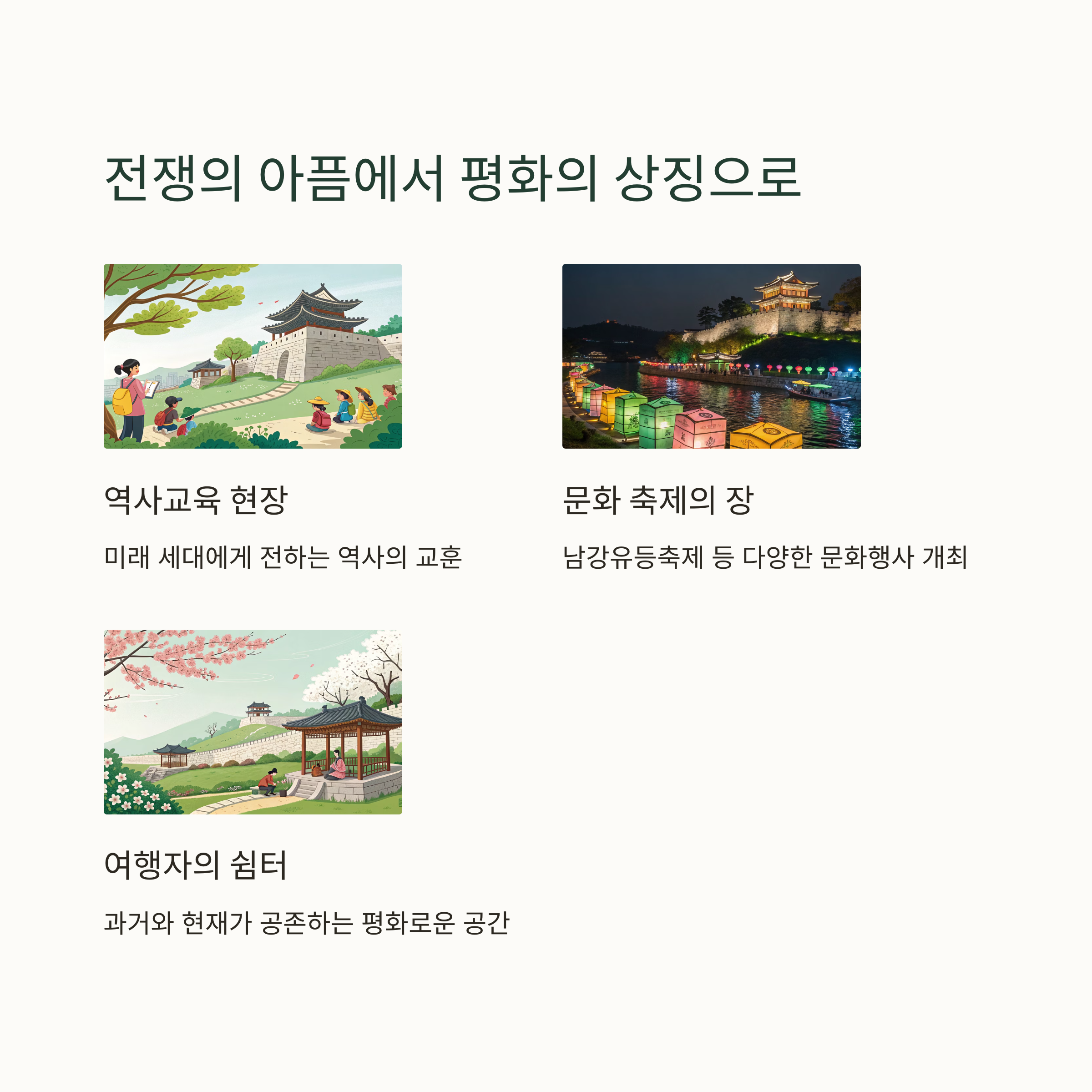 역사교육 현장, 문화 축제의 장소, 여행자의 쉼터로 활용되며