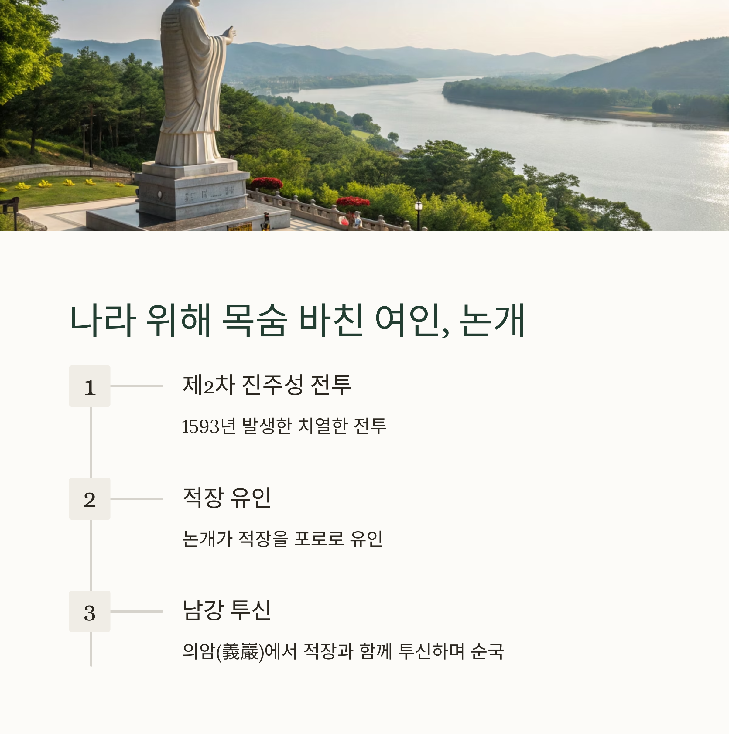 논개의 정신은 지금도 많은 이들의 가슴을 울리는 역사적 교훈입니다.