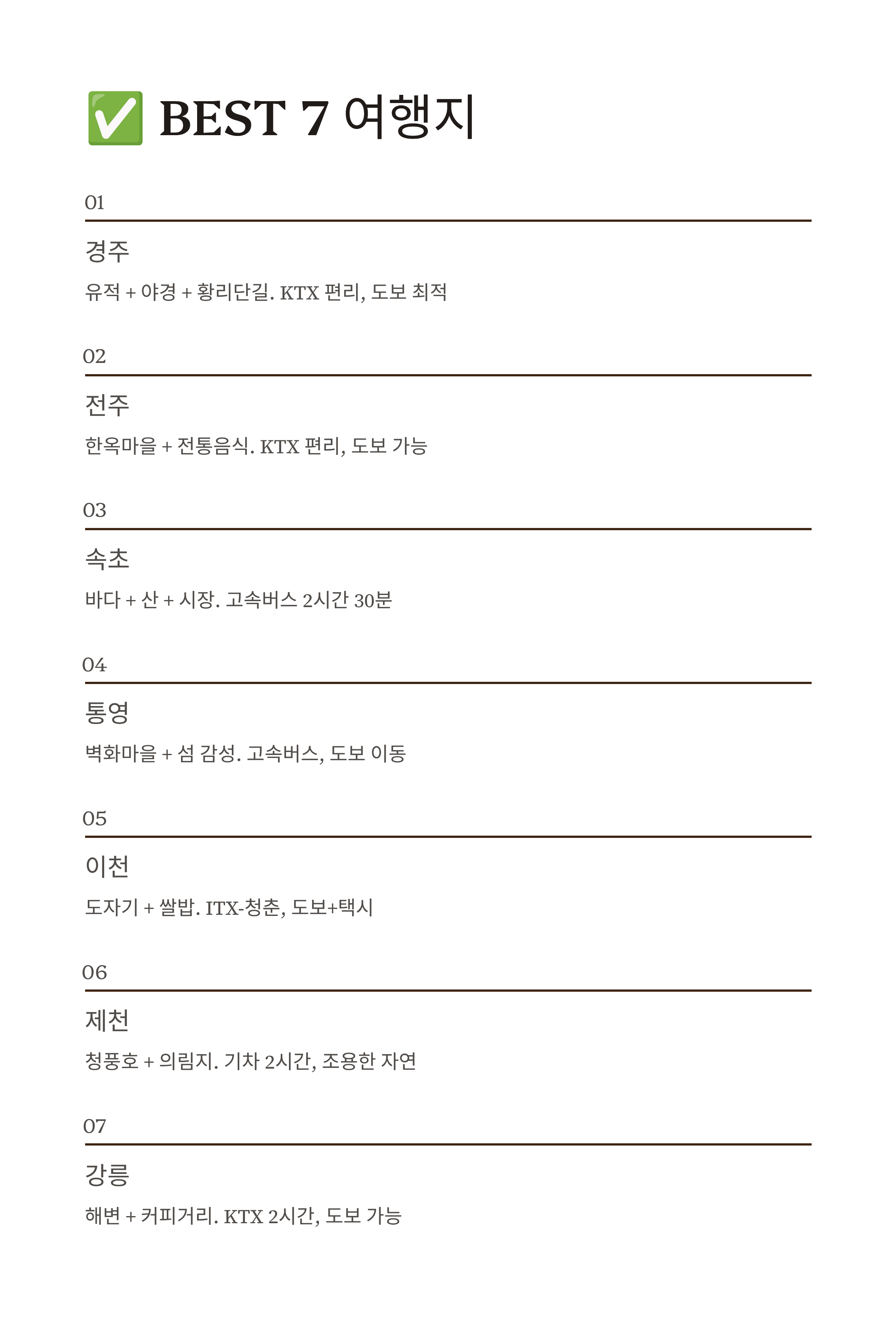 | ⑦ | 강릉 | 해변 산책 + 커피 거리 + 바다뷰 감성 카페 | KTX 약 2시간 / 버스도 이용 편리. 시내 대부분 도보로 가능 |