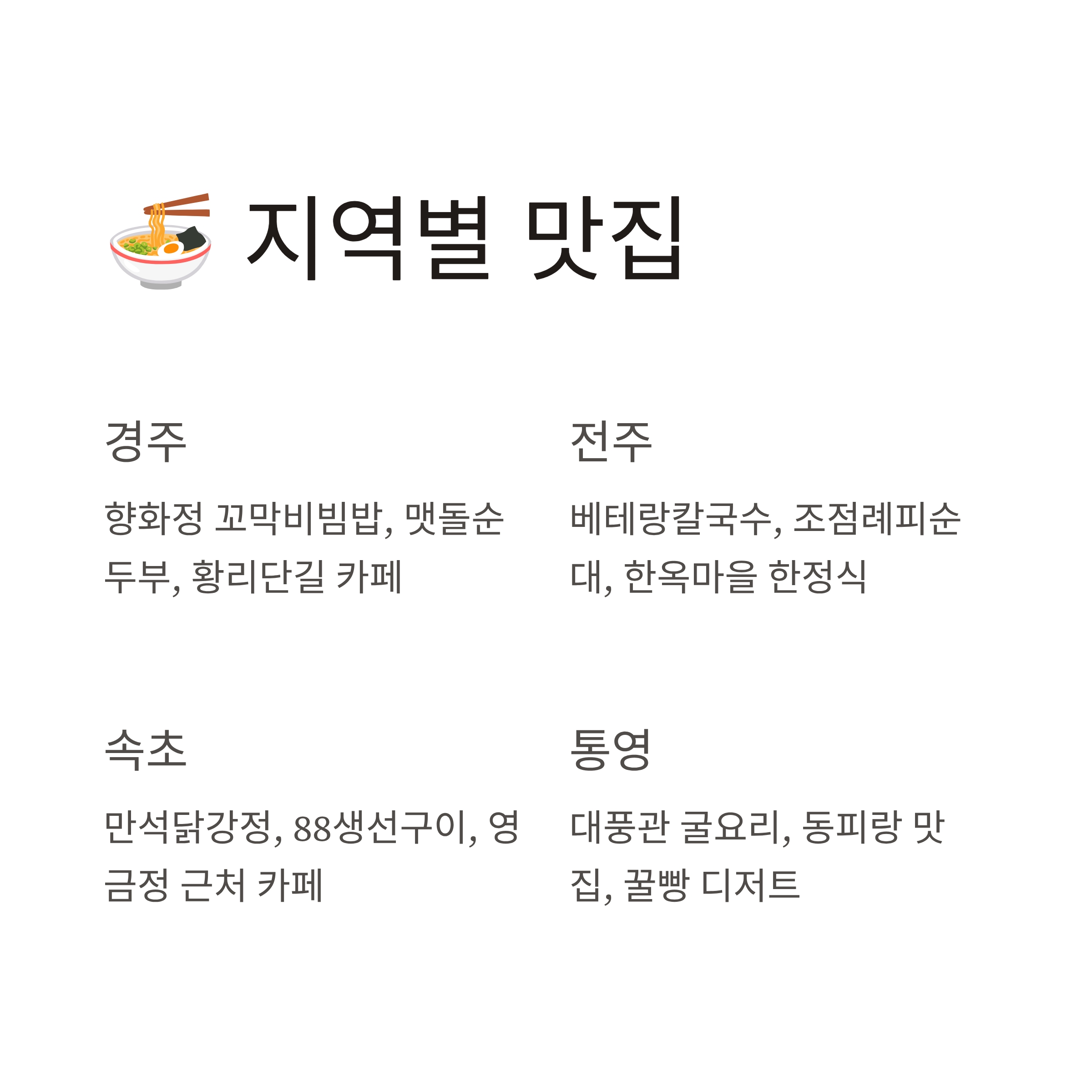 한적한 자연부터 감성 가득한 도시까지, 동선 효율 + 볼거리 + 먹거리 다 잡은 베스트 코스들이야.