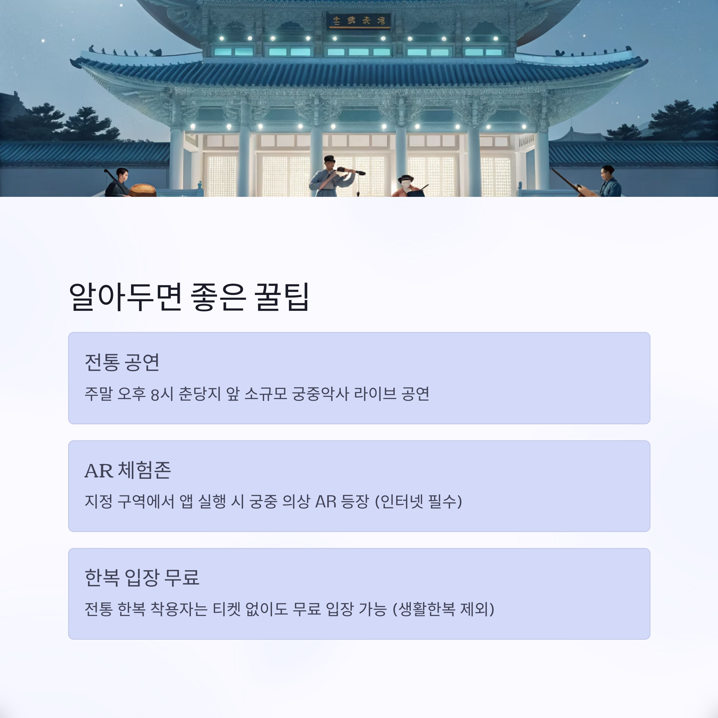 - 한복 입장 무료: 전통 한복 착용자는 티켓 없이도 무료 입장 가능 (생활한복 제외)