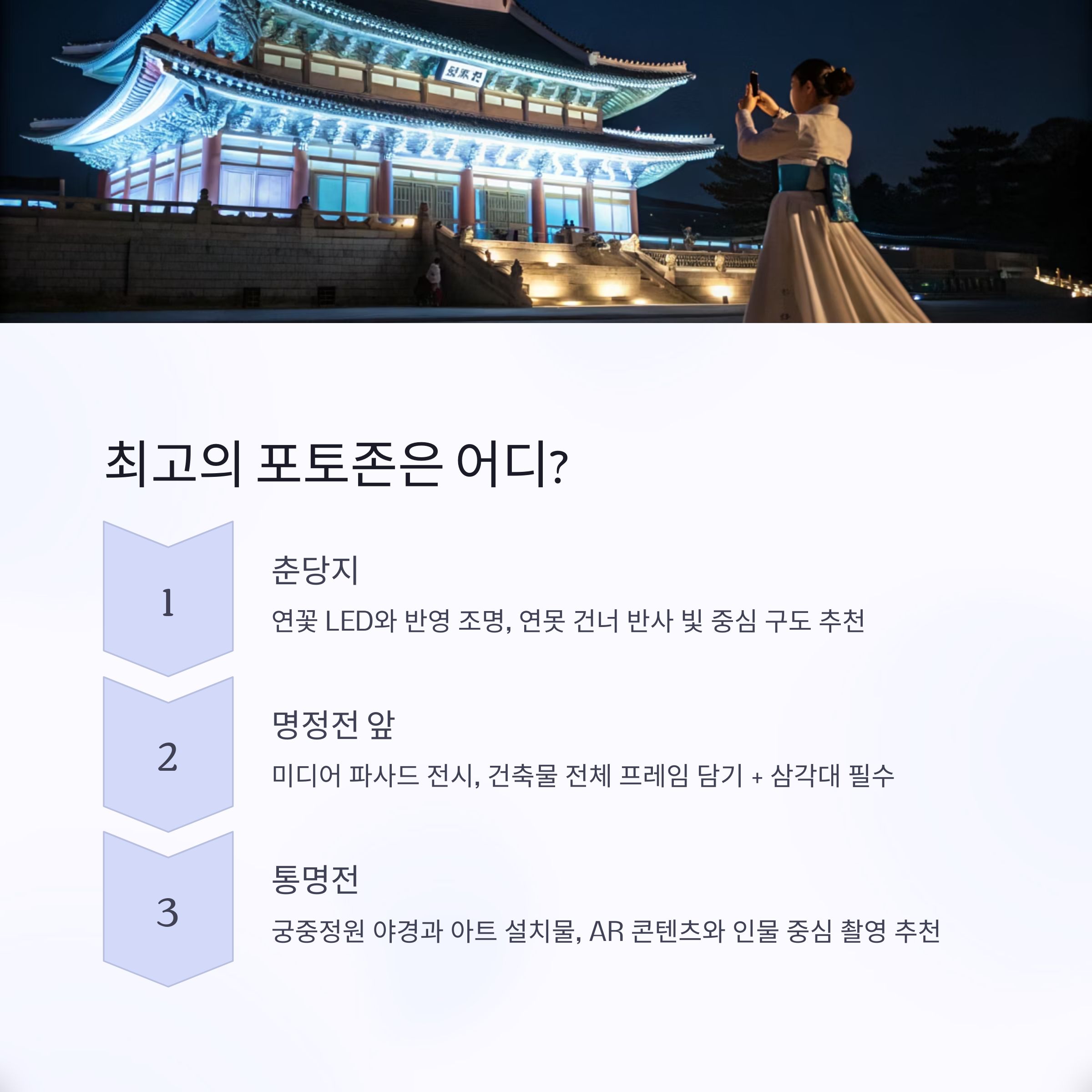 | 통명전 | 궁중정원 야경 + 아트 설치물 | AR 콘텐츠와 인물 중심 촬영 추천 |