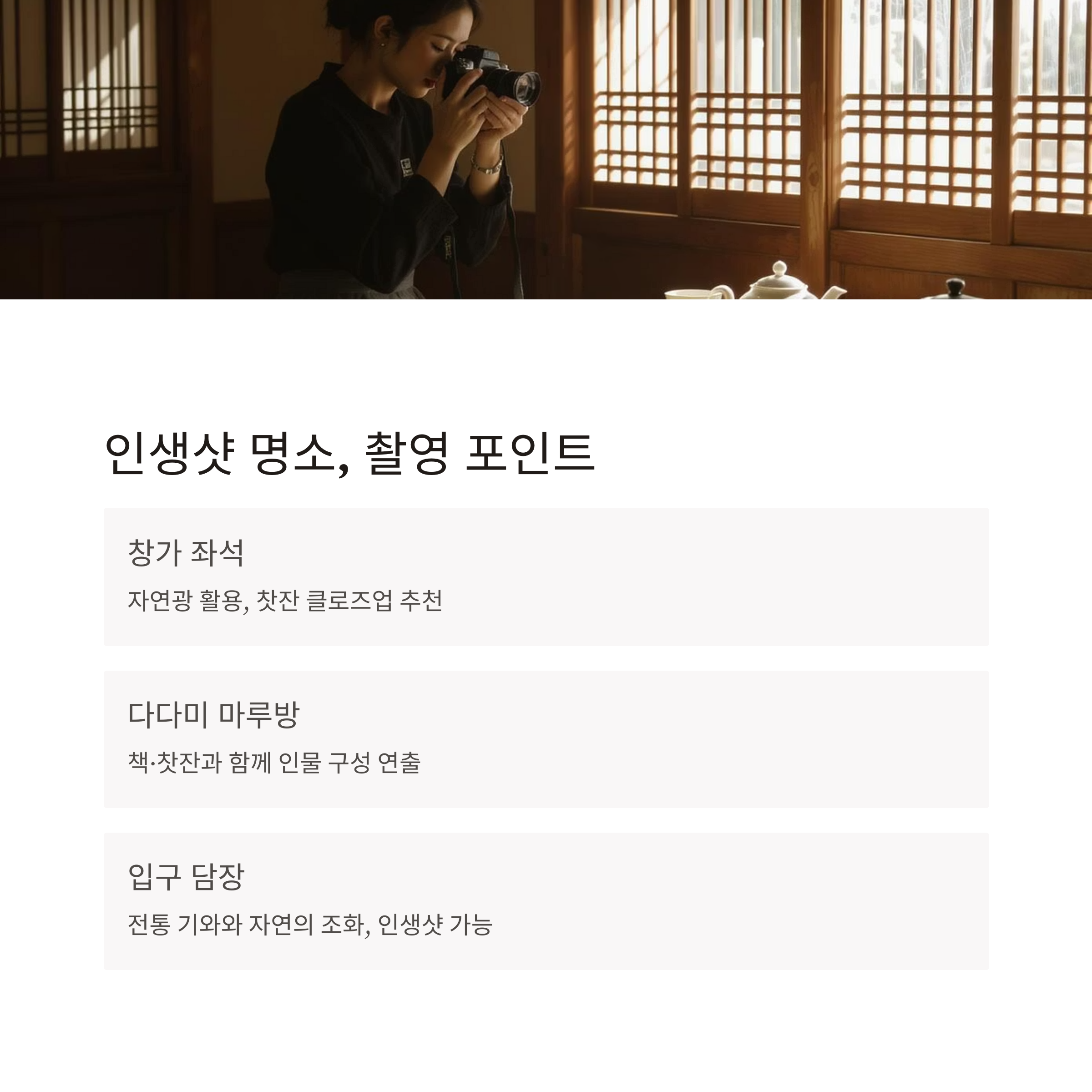 | 창가 좌석 | 자연광 활용, 찻잔 클로즈업 추천 |