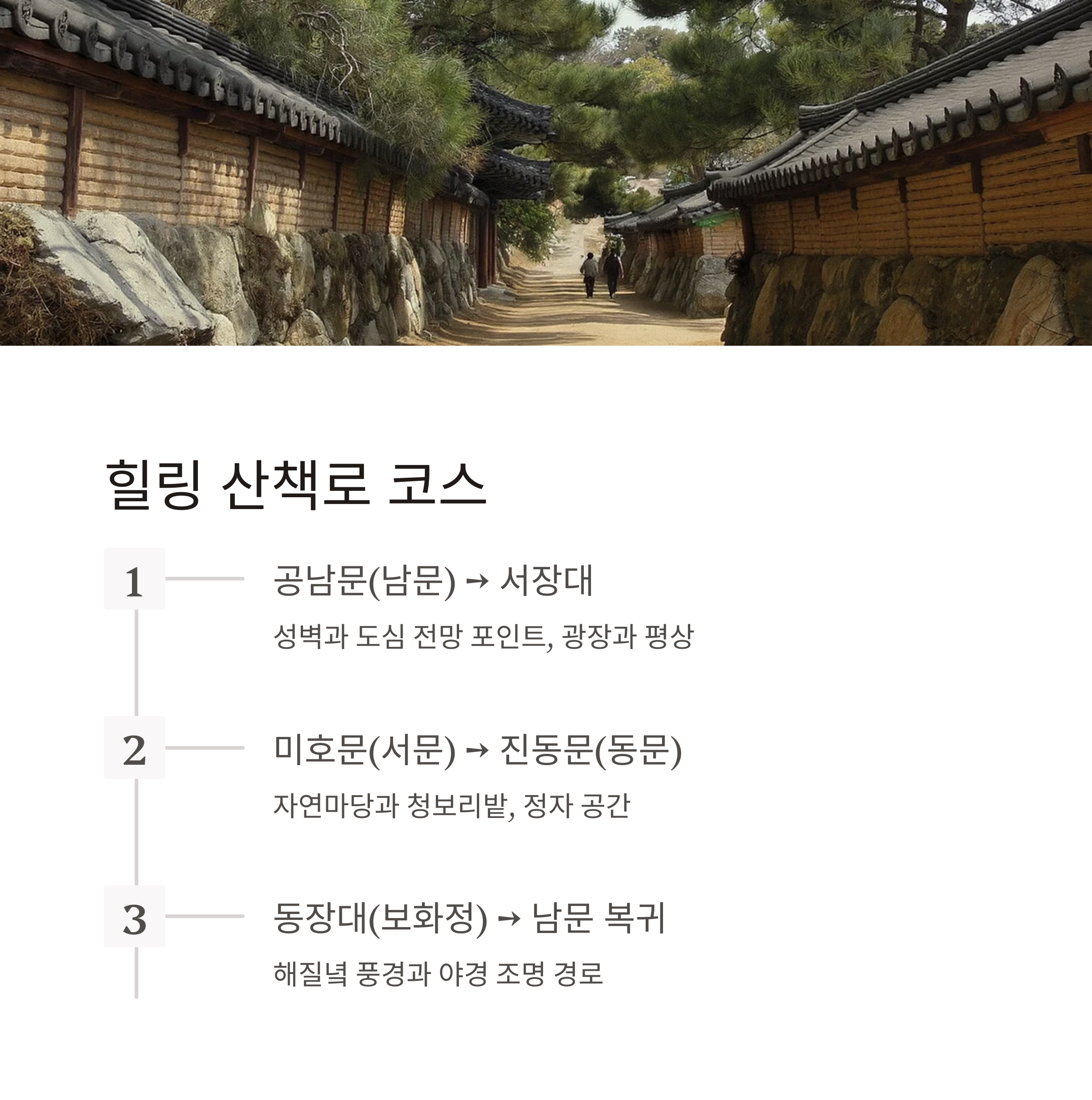 | → 동장대(보화정) → 남문 복귀 | 해질녘 풍경 추천, 야경 조명 경로 포함 |