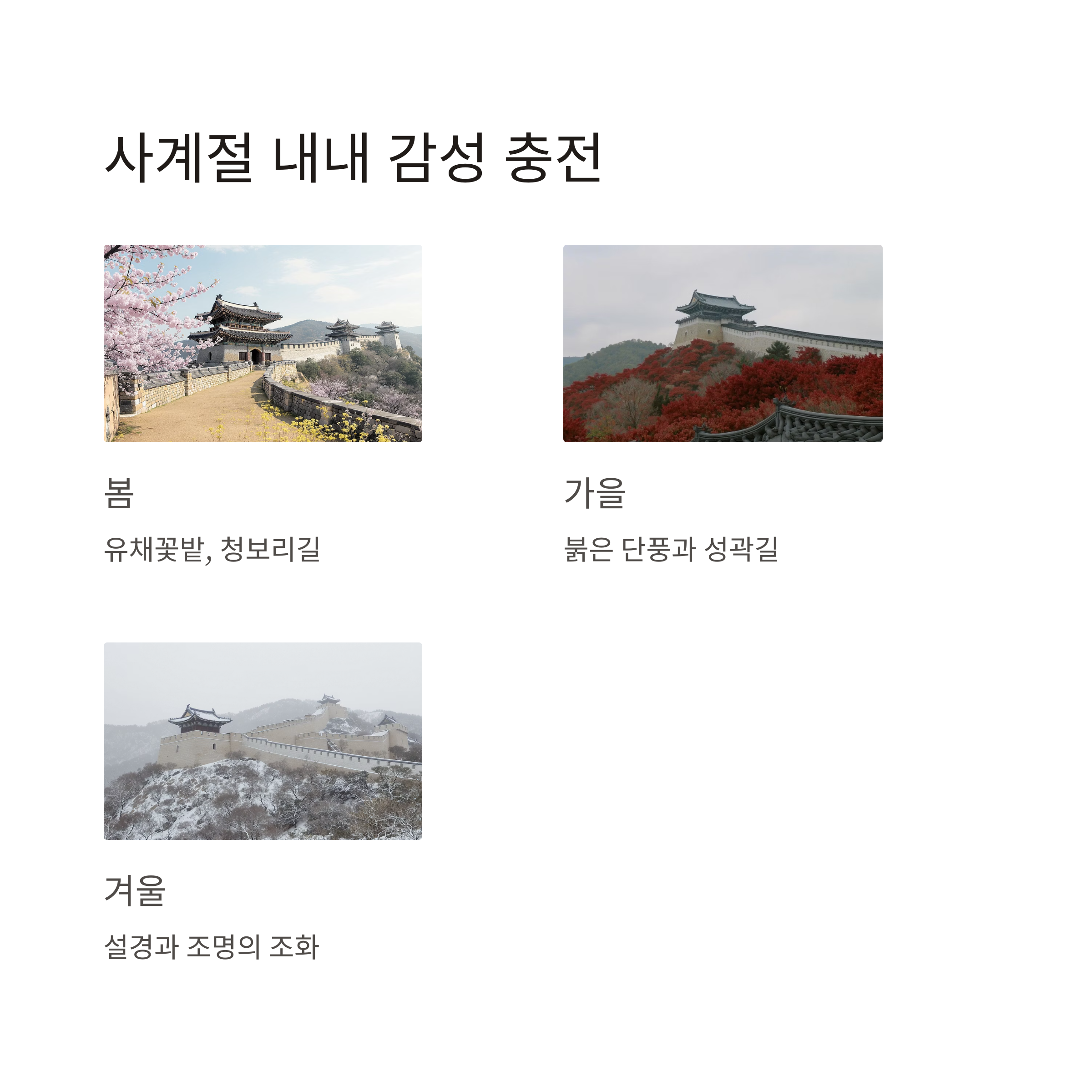 겨울엔 설경이 어우러진 성곽의 고즈넉한 정취까지 사계절 풍경이 다채롭습니다.