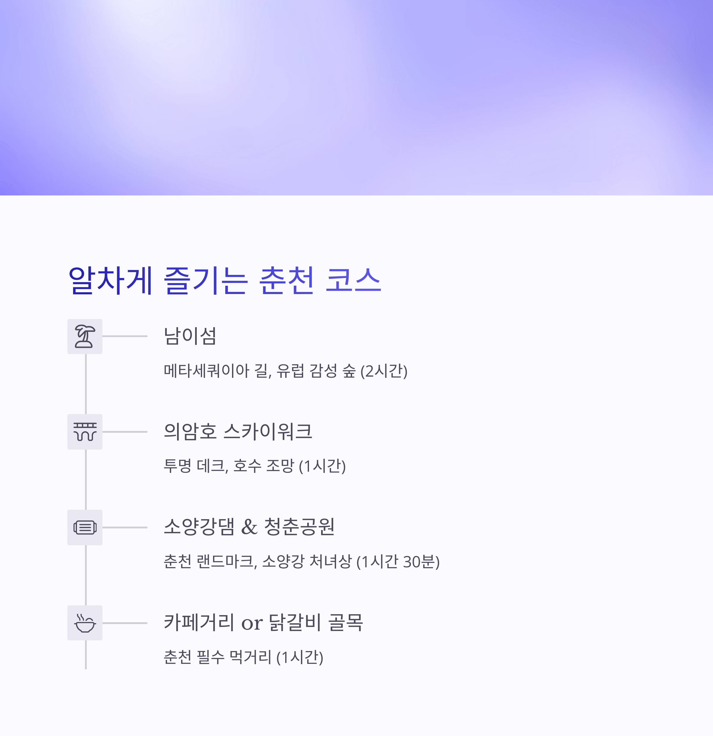 | 4 | 카페거리 or 닭갈비 골목 | 1시간 | 춘천 필수 먹거리 또는 감성 카페에서 마무리 |