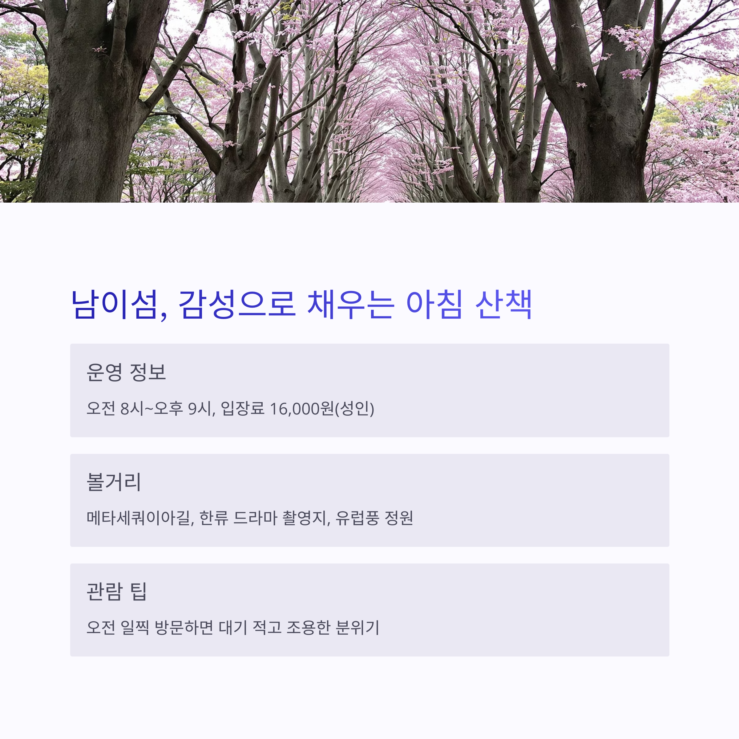 | 1 | 남이섬 | 2시간 | 강변 산책, 메타세쿼이아 길, 유럽 감성 숲 |