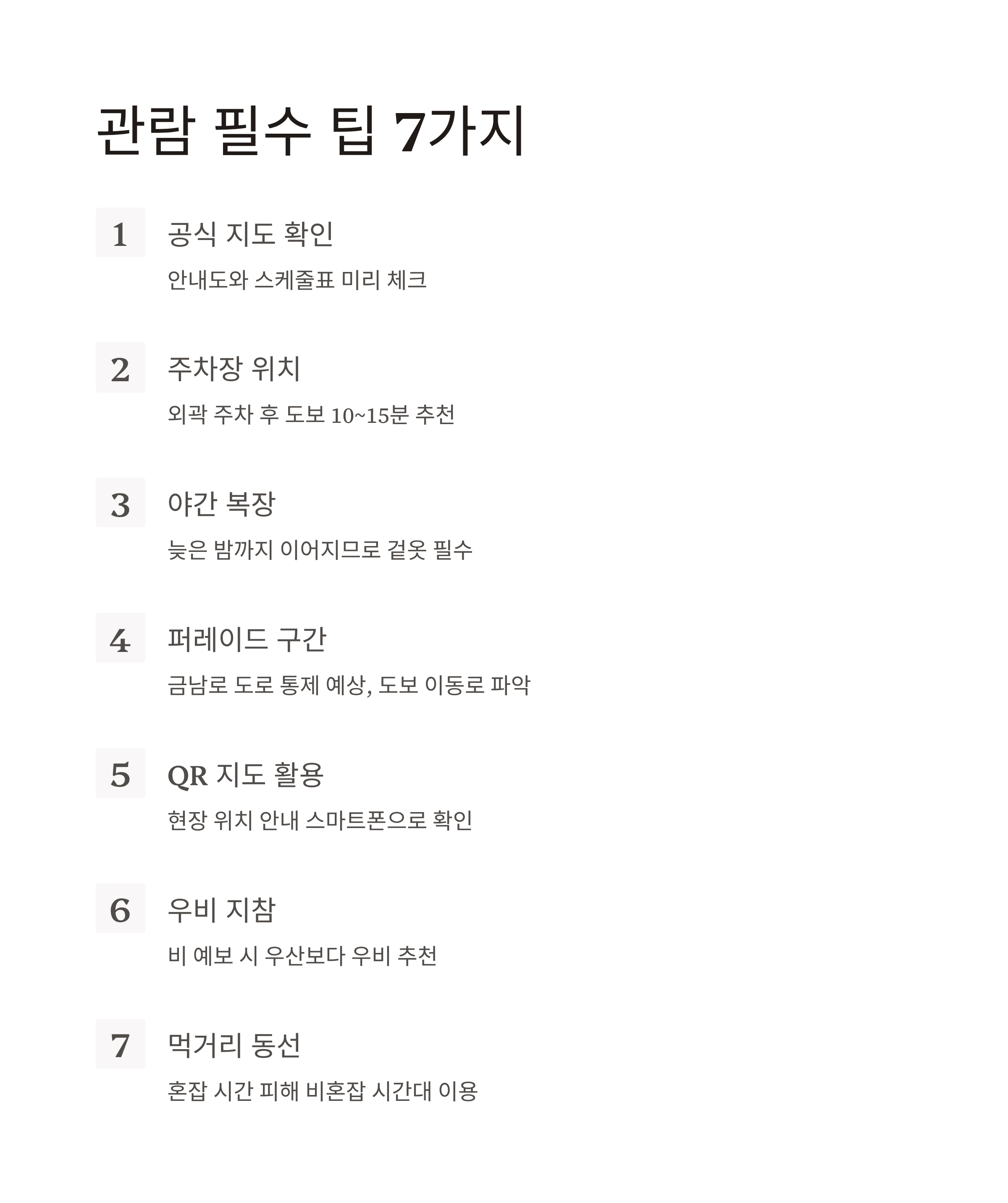 - 주차장 위치 체크: 무료 / 할인 주차장 모두 혼잡 예상 → 가능하면 도보 10~15분 거리 외곽 주차 추천