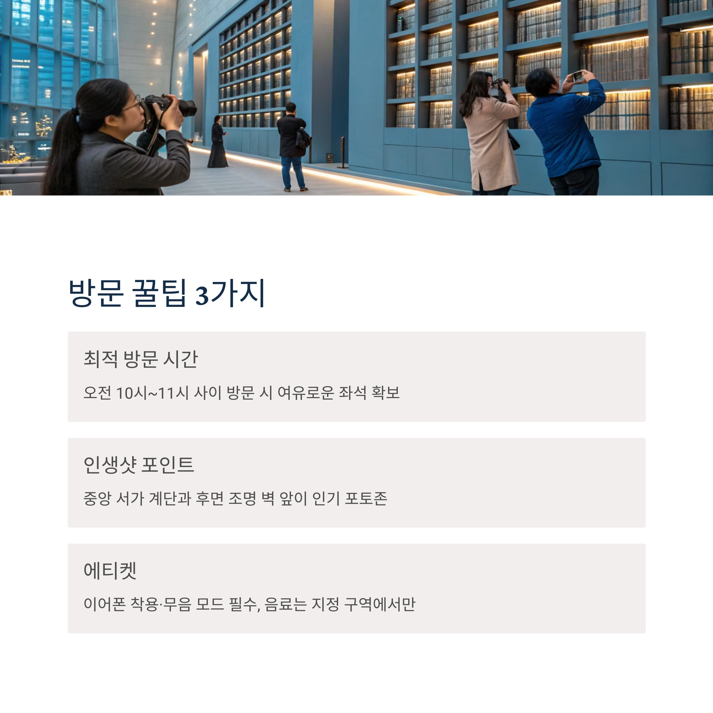 - 포토존은 중앙 서가 계단과 후면 조명 벽 앞이 가장 인기