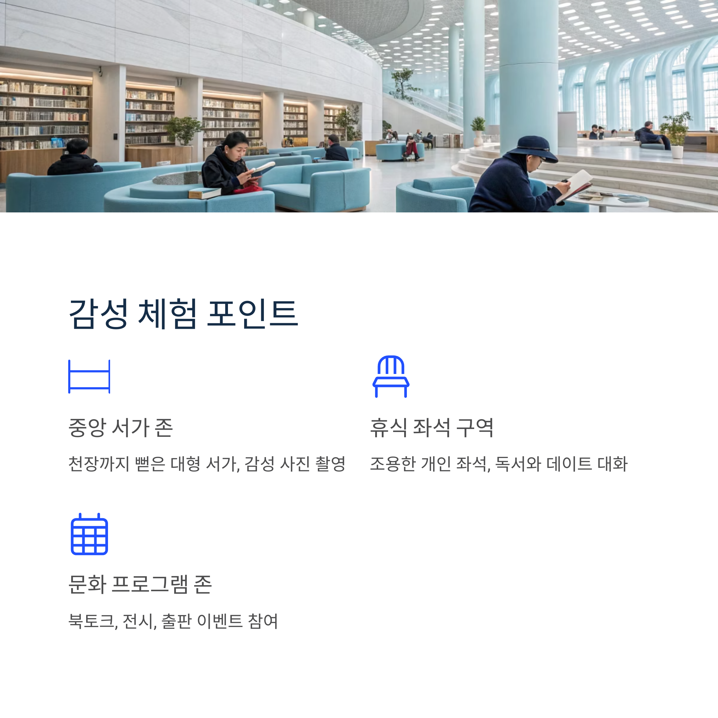 - 내부: 약 13m 높이의 서가, 감성 조명, 좌석 휴식 공간, 전시 및 강연 프로그램 운영