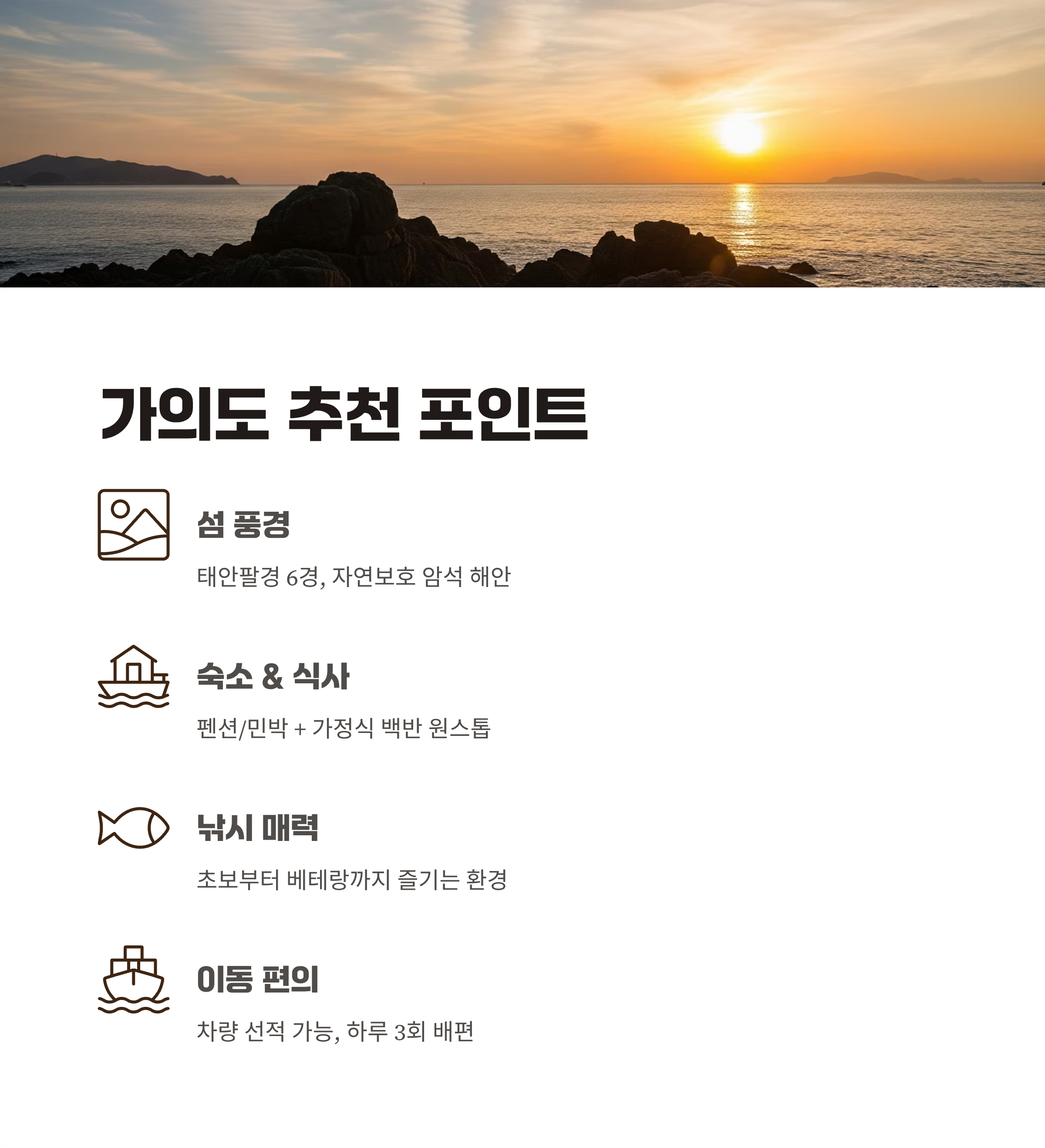 기본 정보부터 숙소, 맛집, 낚시 포인트, 그리고 배편과 교통 정보까지 꼼꼼하게 정리해봤습니다.