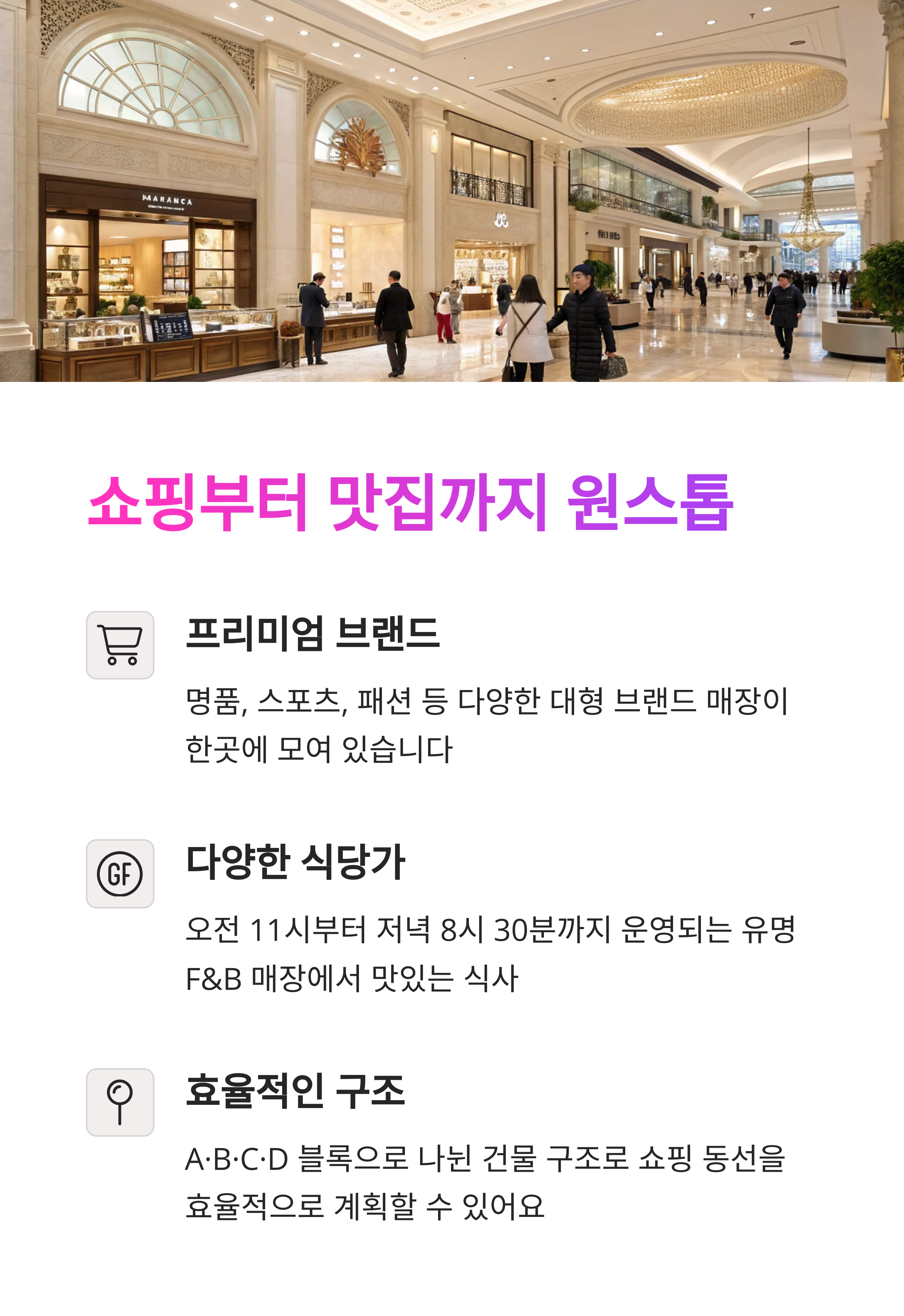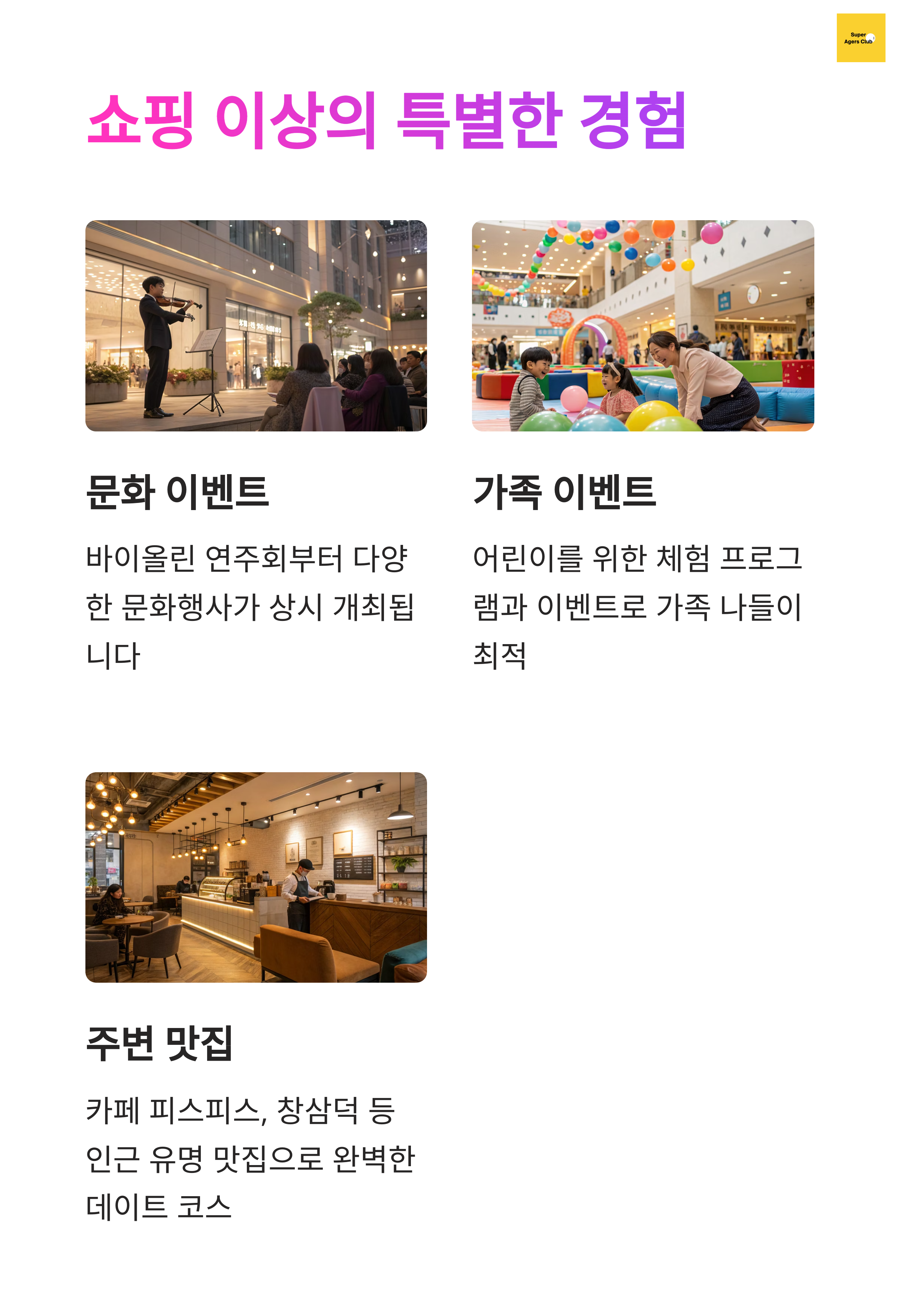 단순한 쇼핑뿐 아니라 음식점과 카페가 많아 식사와 디저트도 즐길 수 있으며, 문화행사와 어린이 이벤트도 자주 열려 가족 단위의 방문객도 충분히 즐길 수 있습니다.