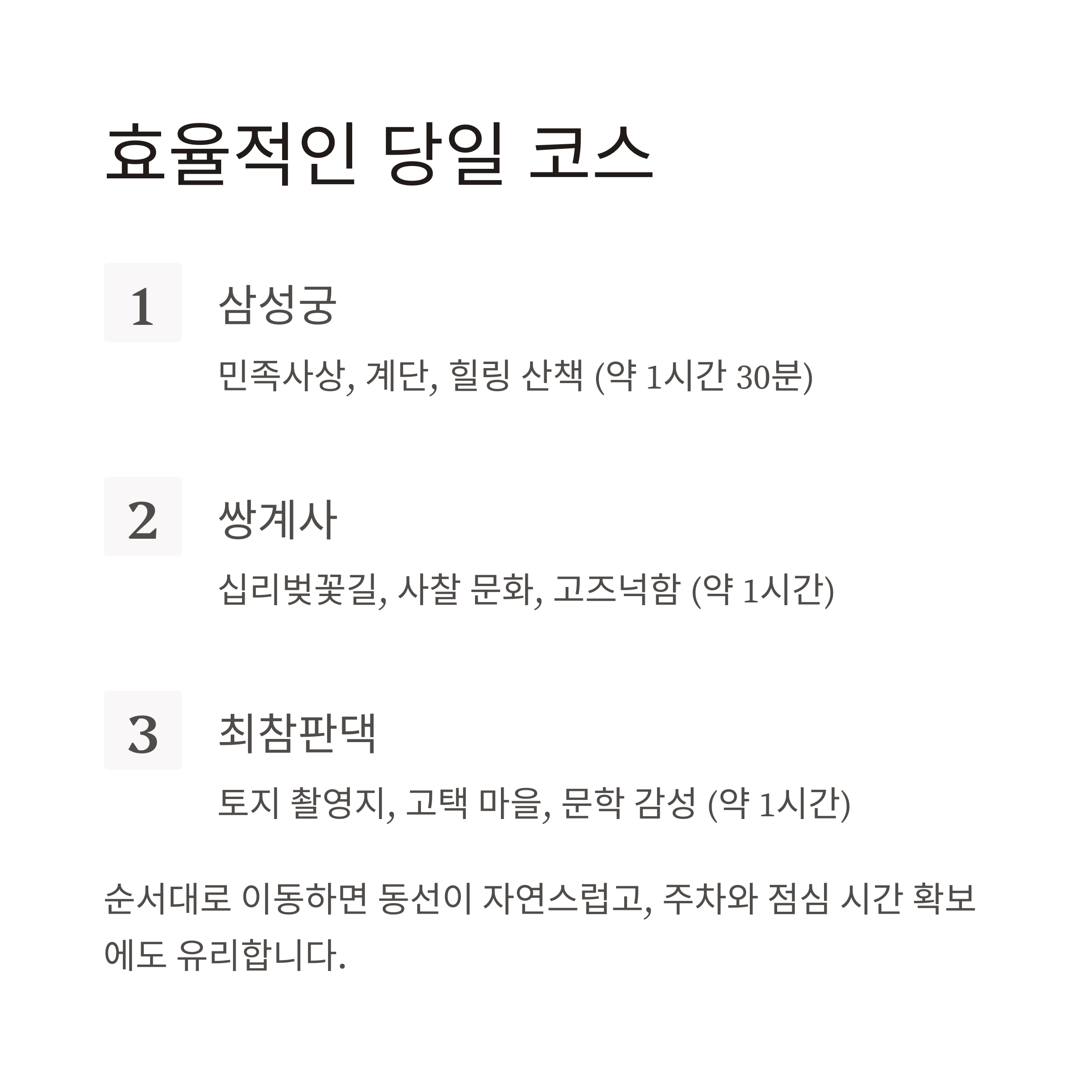 자연·역사·문학을 한 번에 느낄 수 있는 알찬 코스로 꾸릴 수 있습니다.