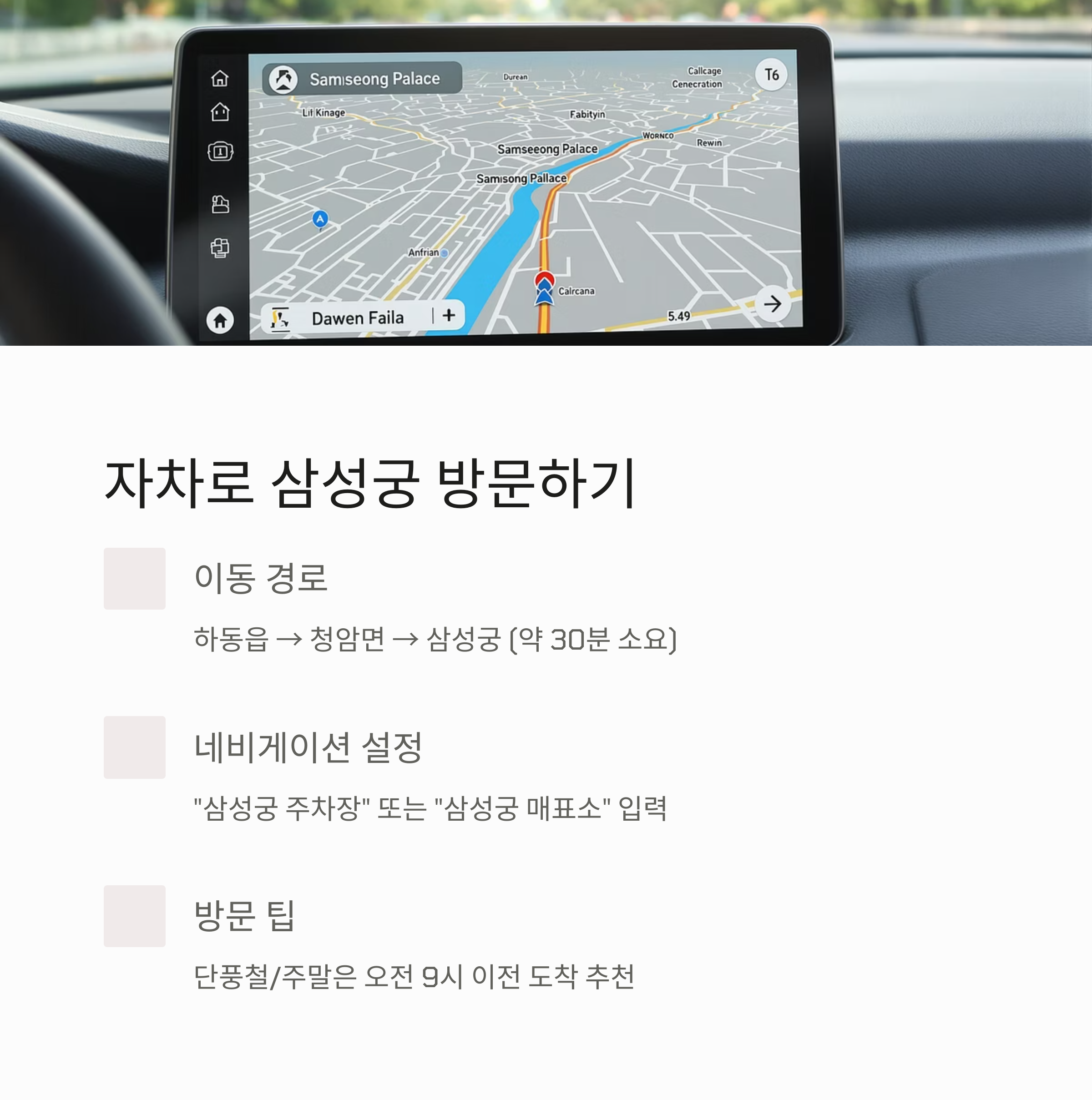 네비게이션에 "삼성궁 주차장" 또는 "삼성궁 매표소"를 입력하면 정확한 위치로 안내됩니다.