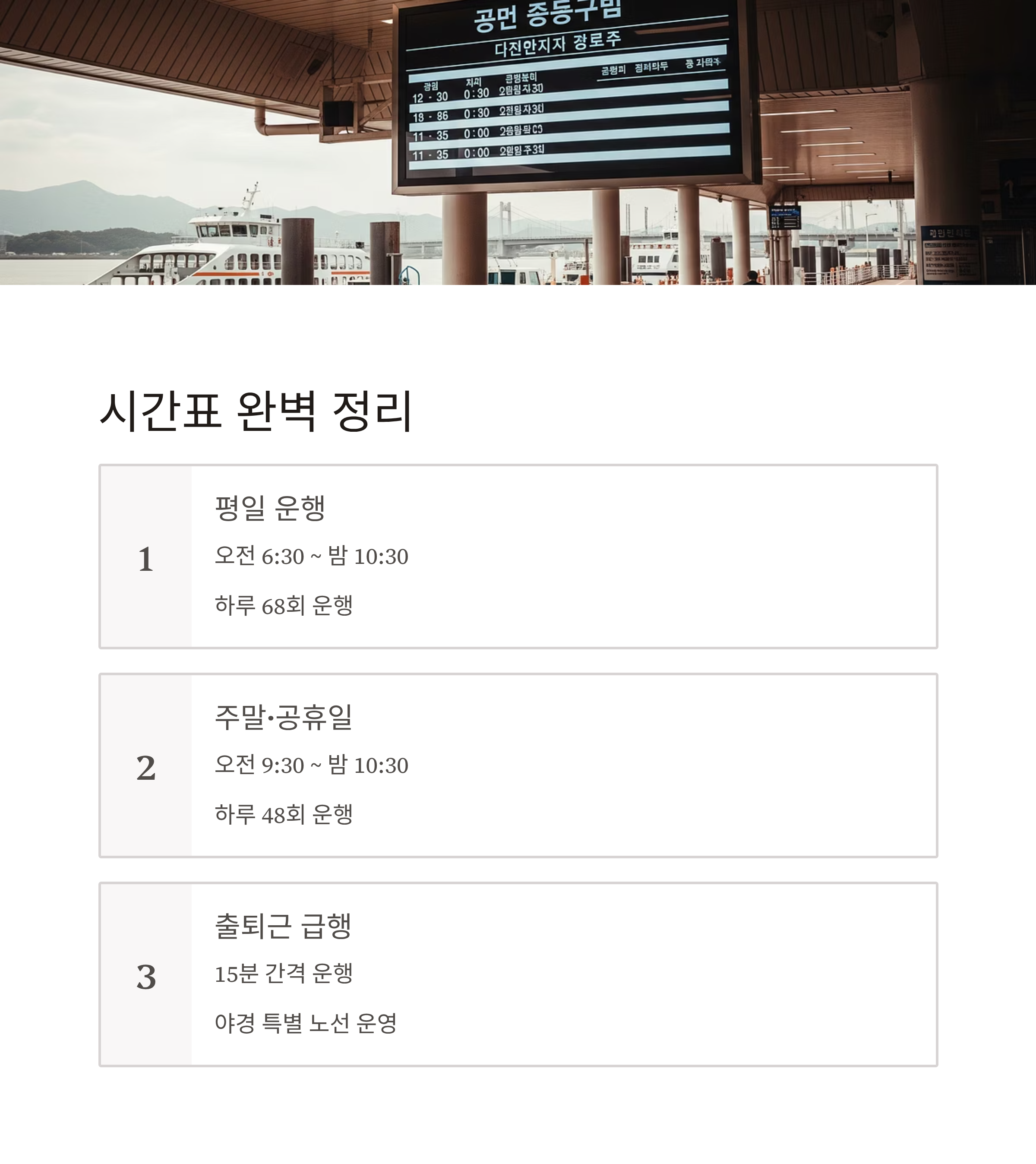 좌석은 선착순이므로 원하는 시간대에 탑승하려면 일찍 도착하는 것이 좋습니다. 특히 출퇴근 시간에는 급행 노선을 이용하면 효율적으로 이동할 수 있고, 주말에는 탑승 대기 시간이 길어질 수 있으니 여유롭게 일정 계획을 세우는 것이 현명합니다.