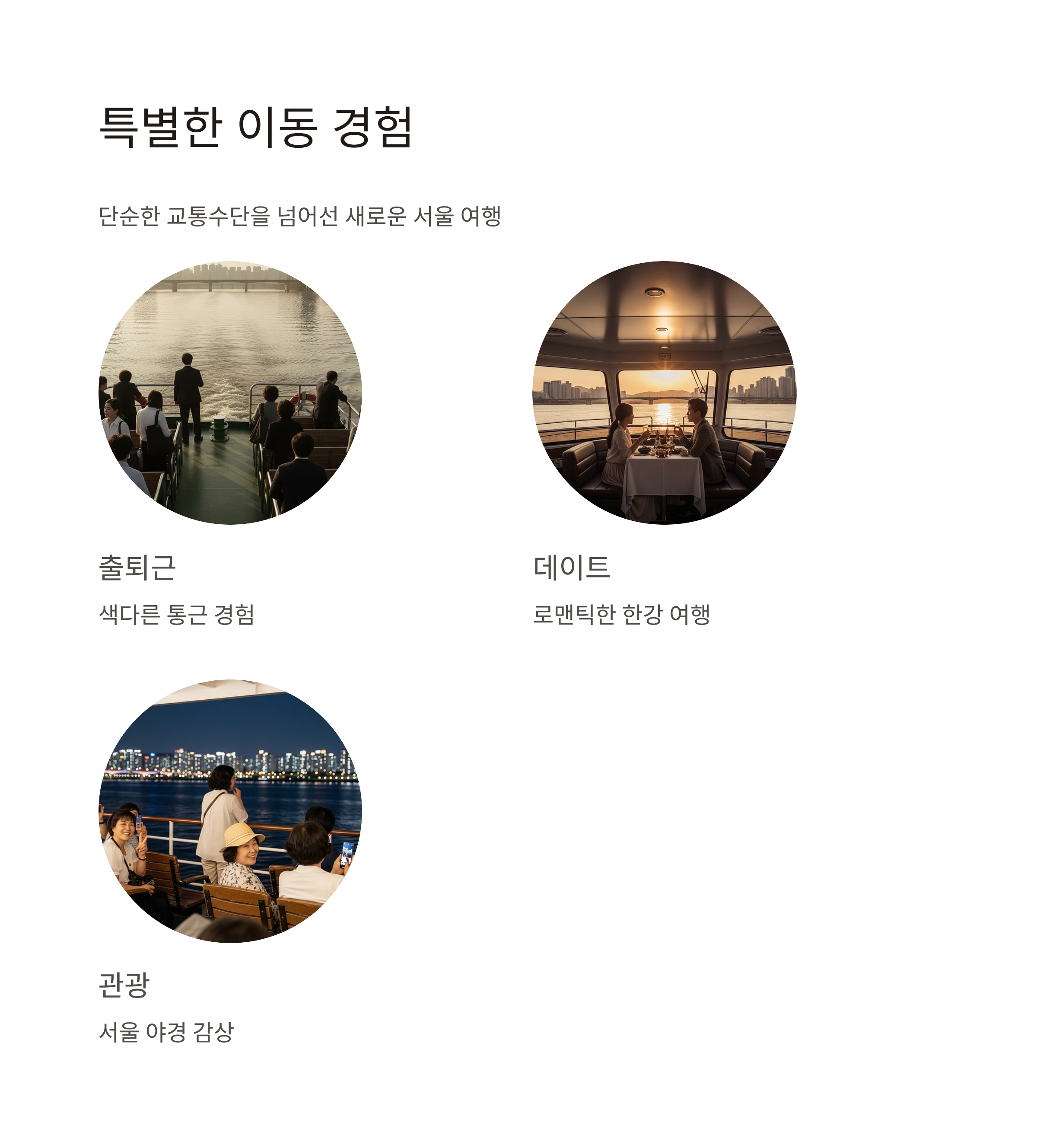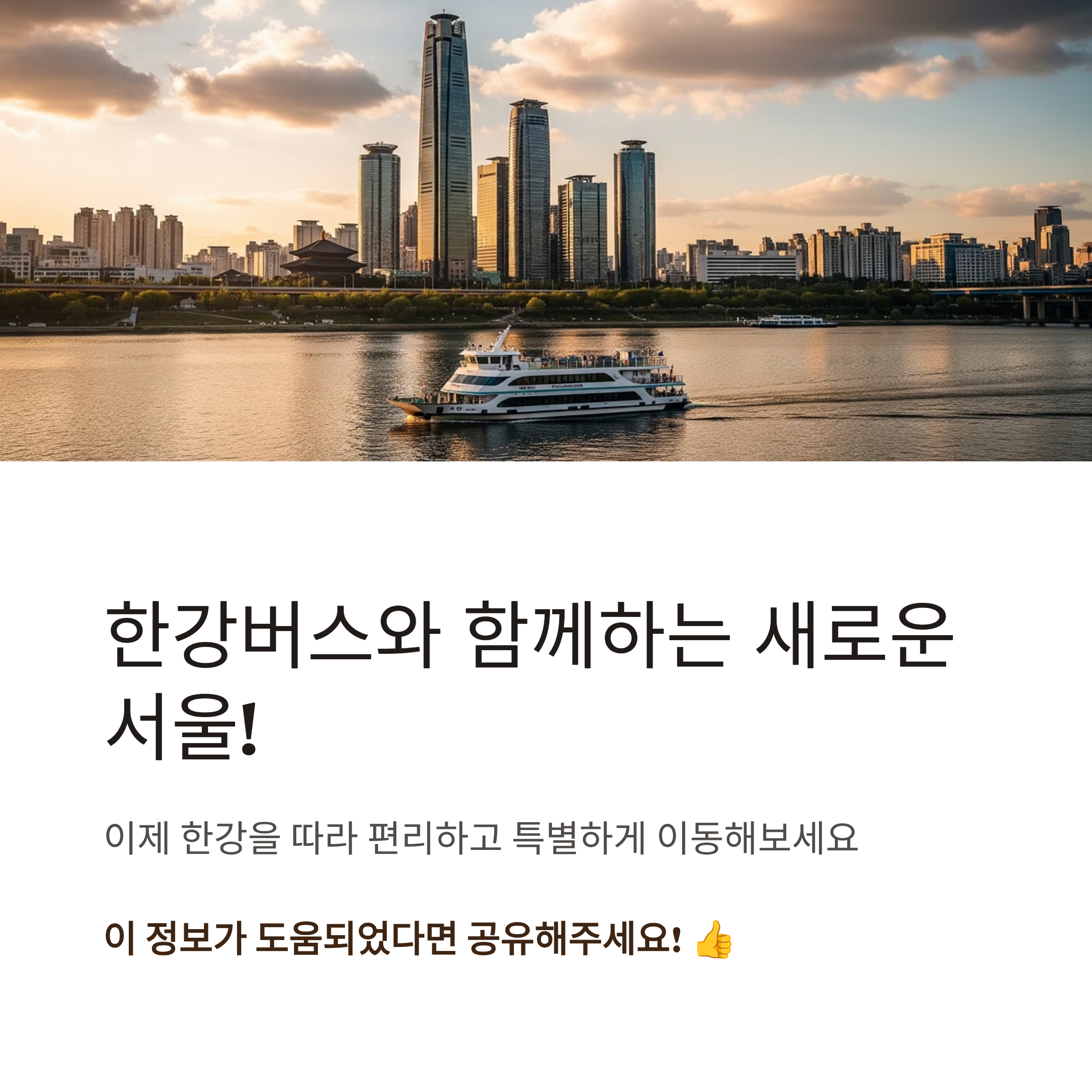 서울 도심을 가로지르는 한강을 따라 이동할 수 있는 한강버스는 단순한 교통수단을 넘어 새로운 경험을 제공합니다. 출퇴근뿐 아니라 주말 나들이, 데이트, 관광까지 다채롭게 활용해보세요.